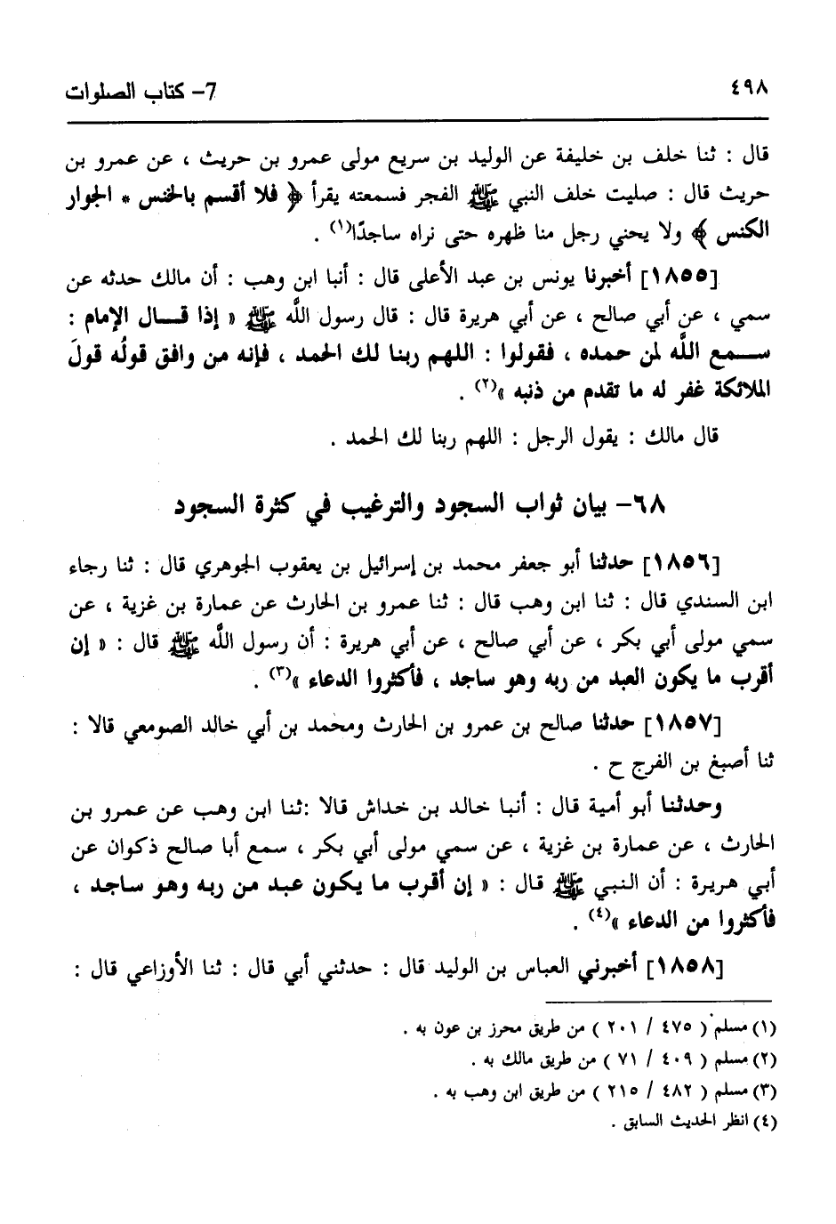 1857 - حَدَّثَنَا صَالِحُ بْنُ عَمْرِو بْنِ الْحَارِثِ، وَمُحَمَّدُ بْنُ أَبِي خَالِدٍ الصَّوْمَعِيُّ قَالَا: ثَنَا أَصْبَغُ بْنُ الْفَرَجِ، ح. وَحَدَّثَنَا أَبُو أُمَيَّةَ قَالَ: أنبا خَالِدُ بْنُ خِدَاشٍ قَالَا: ثَنَا ابْنُ وَهْبٍ، عَنْ عَمْرِو بْنِ الْحَارِثِ، عَنْ عُمَارَةَ بْنِ غَزِيَّةَ، عَنْ سُمَيٍّ مَوْلَى أَبِي بَكْرٍ، سَمِعَ أَبَا صَالِحٍ ذَكْوَانَ، عَنْ أَبِي هُرَيْرَةَ، أَنَّ النَّبِيَّ صَلَّى اللهُ عَلَيْهِ وَسَلَّمَ قَالَ: «§إِنَّ أَقْرَبَ مَا يَكُونُ عَبْدٌ مِنْ رَبِّهِ وَهُوَ سَاجِدٌ فَأَكْثِرُوا مِنَ الدُّعَاءِ»