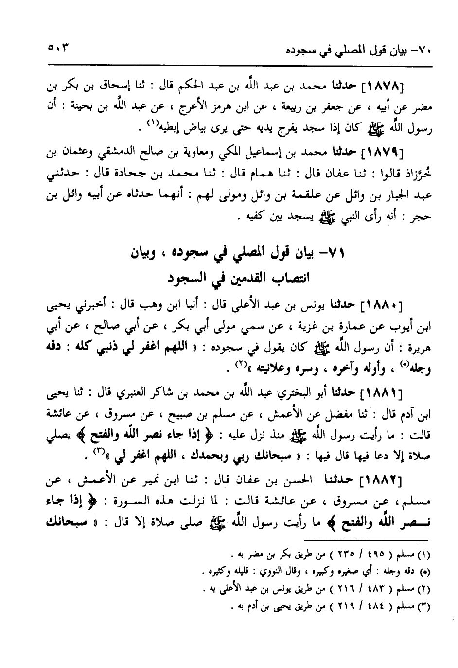 1881 - حَدَّثَنَا أَبُو الْبَخْتَرِيِّ عَبْدُ اللَّهِ بْنُ مُحَمَّدِ بْنِ شَاكِرٍ الْعَنْبَرِيُّ قَالَ: ثَنَا يَحْيَى بْنُ آدَمَ قَالَ: ثَنَا مُفَضَّلٌ، عَنِ الْأَعْمَشِ، عَنْ مُسْلِمِ بْنِ صُبَيْحٍ، عَنْ مَسْرُوقٍ، عَنْ عَائِشَةَ قَالَتْ: مَا رَأَيْتُ رَسُولَ اللَّهِ صَلَّى اللهُ عَلَيْهِ وَسَلَّمَ مُنْذُ نَزَلَ عَلَيْهِ {إِذَا جَاءَ نَصْرُ اللَّهِ وَالْفَتْحُ} [النصر: 1] يُصَلِّي صَلَاةً إِلَّا دَعَا فِيهَا قَالَ فِيهَا: «§سُبْحَانَكَ رَبِّي وَبِحَمْدِكَ اللَّهُمَّ اغْفِرْ لِي»