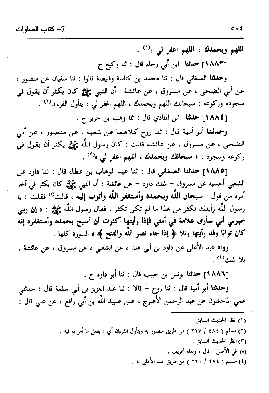 1884 - حَدَّثَنَا ابْنُ الْمُنَادِي، قَالَ: ثَنَا وَهْبُ بْنُ جَرِيرٍ، ح. وَحَدَّثَنَا أَبُو أُمَيَّةَ، قَالَ: ثَنَا رَوْحٌ، كِلَاهُمَا عَنْ شُعْبَةَ، عَنْ مَنْصُورٍ، عَنْ أَبِي الضُّحَى، عَنْ مَسْرُوقٍ، عَنْ عَائِشَةَ، قَالَتْ: كَانَ رَسُولُ اللَّهِ صَلَّى اللهُ عَلَيْهِ وَسَلَّمَ §يُكْثِرُ أَنْ يَقُولَ فِي رُكُوعِهِ وَسُجُودِهِ: «سُبْحَانَكَ وَبِحَمْدِكَ اللَّهُمَّ اغْفِرْ لِي»