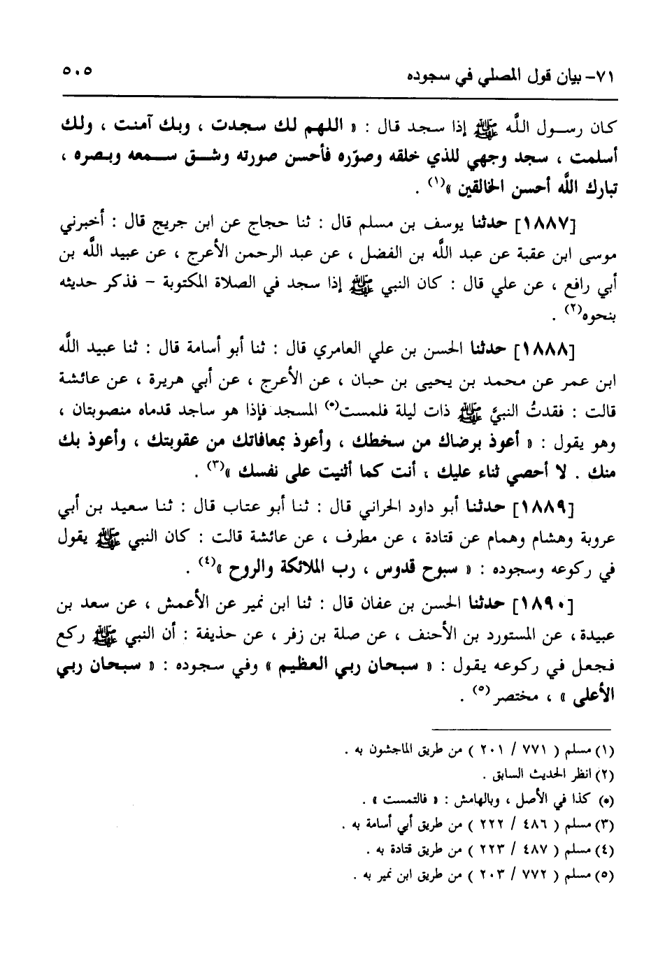 1888 - حَدَّثَنَا الْحَسَنُ بْنُ عَلِيٍّ الْعَامِرِيُّ قَالَ: ثَنَا أَبُو أُسَامَةَ قَالَ: ثَنَا عُبَيْدُ اللَّهِ بْنُ عُمَرَ، عَنْ مُحَمَّدِ بْنِ يَحْيَى بْنِ حَبَّانَ، عَنِ الْأَعْرَجِ، عَنْ أَبِي هُرَيْرَةَ، عَنْ عَائِشَةَ قَالَتْ: فَقَدْتُ النَّبِيَّ صَلَّى اللهُ عَلَيْهِ وَسَلَّمَ ذَاتَ لَيْلَةٍ فَلَمَسْتُ الْمَسْجِدَ فَإِذَا هُوَ سَاجِدٌ قَدَمَاهُ مَنْصُوبَتَانِ وَهُوَ يَقُولُ: «§أَعُوذُ بِرِضَاكَ مِنْ سَخَطِكَ، وَأَعُوذُ بِمُعَافَاتِكَ مِنْ عُقُوبَتِكَ، وَأَعُوذُ بِكَ مِنْكَ، لَا أُحْصِي ثَنَاءً عَلَيْكَ أَنْتَ كَمَا أَثْنَيْتَ عَلَى نَفْسِكَ»