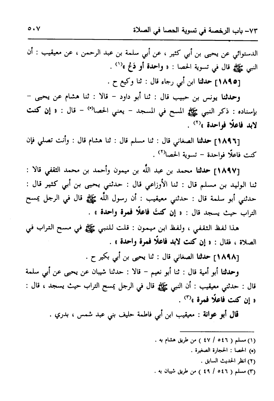 1896 - حَدَّثَنَا الصَّغَانِيُّ قَالَ: ثَنَا مُسْلِمٌ قَالَ: ثَنَا هِشَامٌ قَالَ: «§وَأَنْتَ تُصَلِّي، فَإِنْ كُنْتَ فَاعِلًا فَوَاحِدَةً تَسْوِيَةُ الْحَصَا»