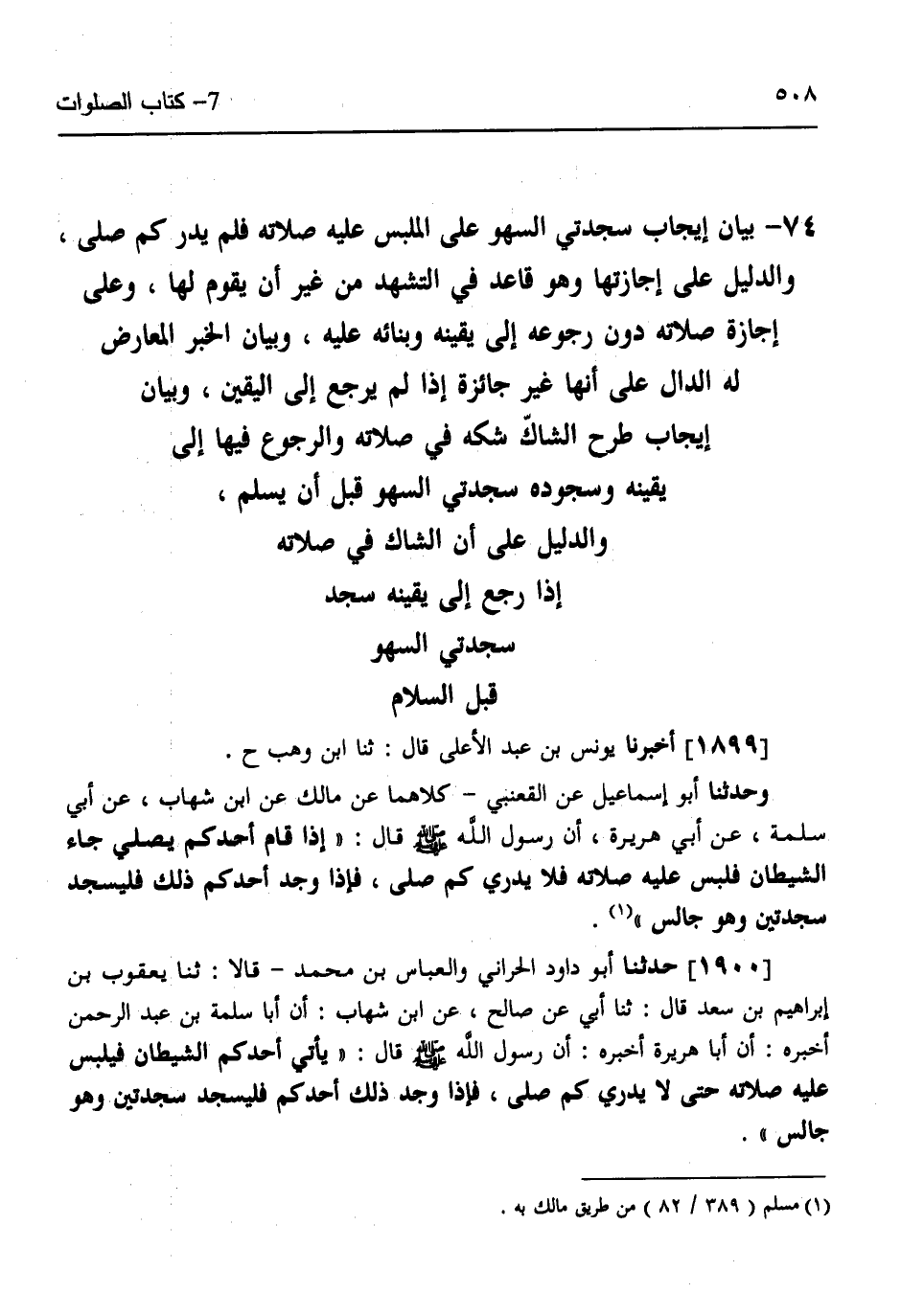 1899 - أَخْبَرَنَا يُونُسُ بْنُ عَبْدِ الْأَعْلَى، قَالَ: ثَنَا ابْنُ وَهْبٍ، ح. وَحَدَّثَنَا أَبُو إِسْمَاعِيلَ، عَنِ الْقَعْنَبِيِّ كِلَاهُمَا، عَنْ مَالِكٍ، عَنِ ابْنِ شِهَابٍ، عَنْ أَبِي سَلَمَةَ، عَنْ أَبِي هُرَيْرَةَ، أَنَّ رَسُولَ اللَّهِ صَلَّى اللهُ عَلَيْهِ وَسَلَّمَ، قَالَ: «§إِذَا قَامَ أَحَدُكُمْ يُصَلِّي جَاءَ الشَّيْطَانُ فَلَبَّسَ عَلَيْهِ صَلَاتَهُ فَلَا يَدْرِي كَمْ صَلِّي، فَإِذَا وَجَدَ أَحَدُكُمْ ذَلِكَ فَلْيَسْجُدْ سَجْدَتَيْنِ وَهُوَ جَالِسٌ»