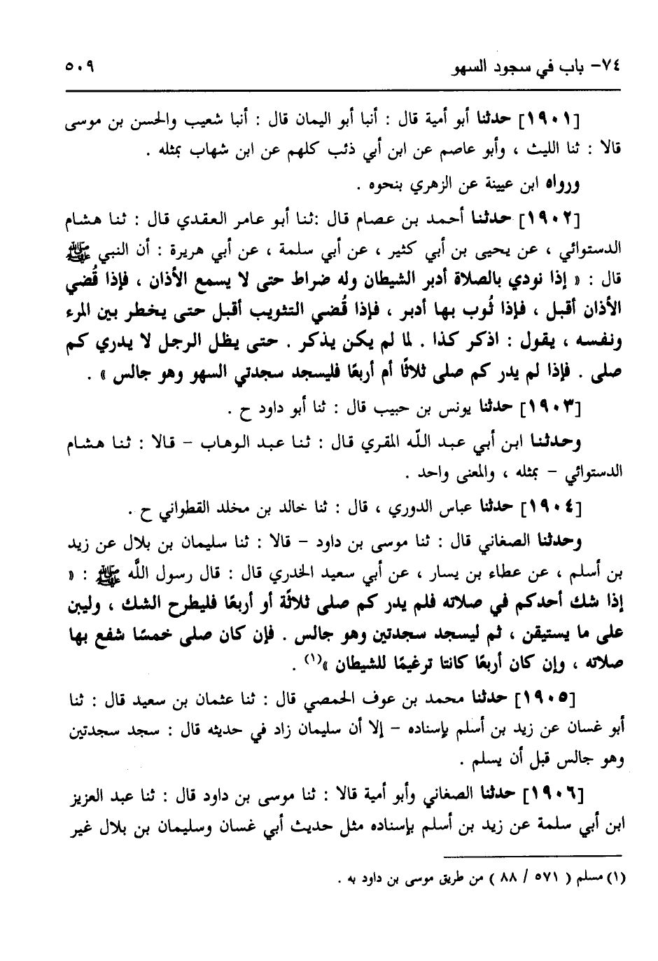 1905 - حَدَّثَنَا مُحَمَّدُ بْنُ عَوْفٍ الْحِمْصِيُّ قَالَ: ثَنَا عُثْمَانُ بْنُ سَعِيدٍ قَالَ: ثَنَا أَبُو غَسَّانَ، عَنْ زَيْدِ بْنِ أَسْلَمَ، بِإِسْنَادِهِ إِلَّا أَنَّ سُلَيْمَانَ زَادَ فِي حَدِيثِهِ قَالَ: «§سَجَدَ سَجْدَتَيْنِ وَهُوَ جَالِسٌ قَبْلَ أَنْ يُسَلِّمَ»