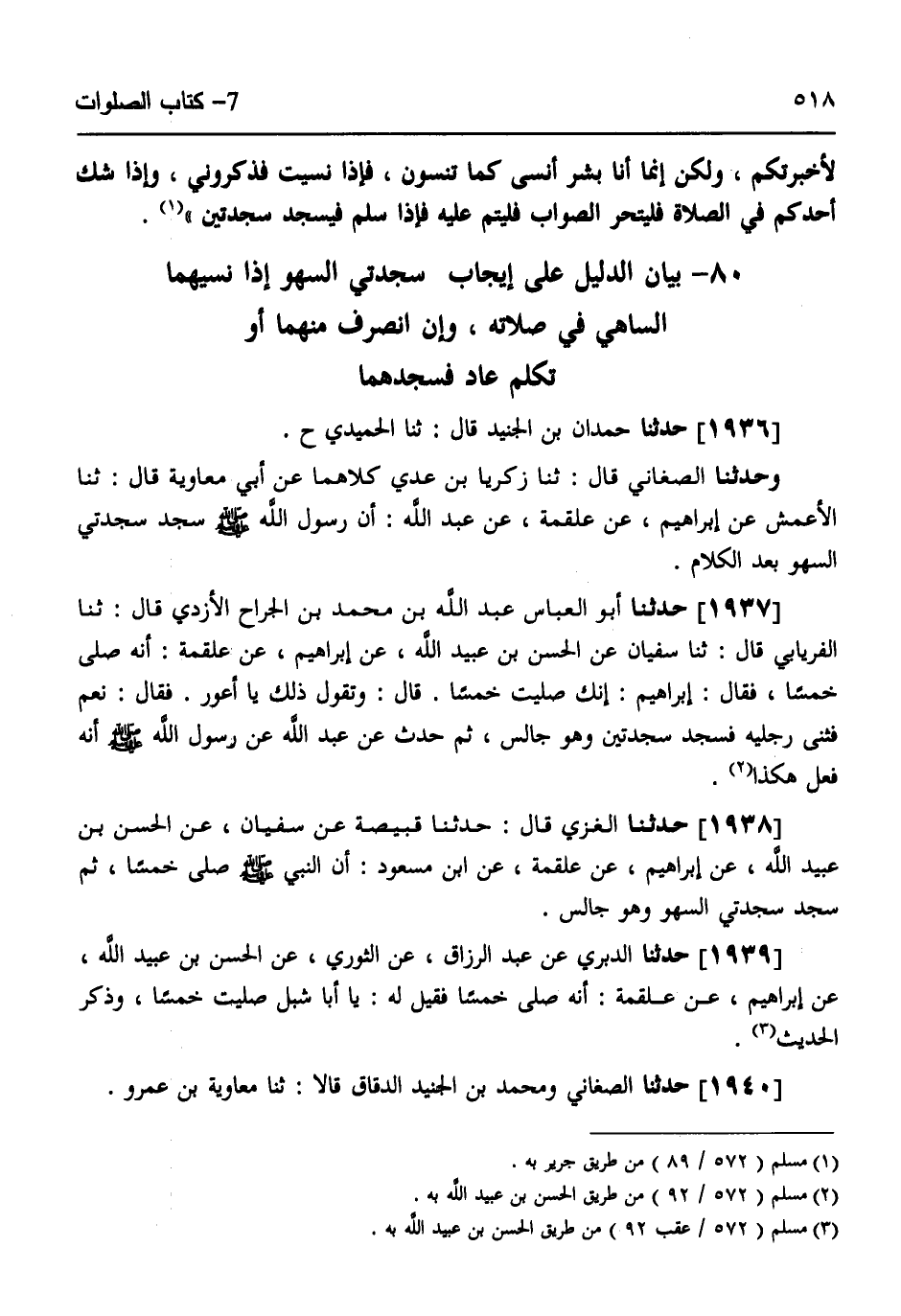 1936 - حَدَّثَنَا حَمْدَانُ بْنُ الْجُنَيْدِ قَالَ: ثَنَا الْحُمَيْدِيُّ، ح. وَحَدَّثَنَا الصَّغَانِيُّ قَالَ: ثَنَا زَكَرِيَّا بْنُ عَدِيٍّ كِلَاهُمَا، عَنْ أَبِي مُعَاوِيَةَ قَالَ: ثَنَا الْأَعْمَشُ، عَنْ إِبْرَاهِيمَ، عَنْ عَلْقَمَةَ، عَنْ عَبْدِ اللَّهِ، «أَنَّ رَسُولَ اللَّهِ صَلَّى اللهُ عَلَيْهِ وَسَلَّمَ §سَجَدَ سَجْدَتَيِ السَّهْوِ بَعْدَ الْكَلَامِ»