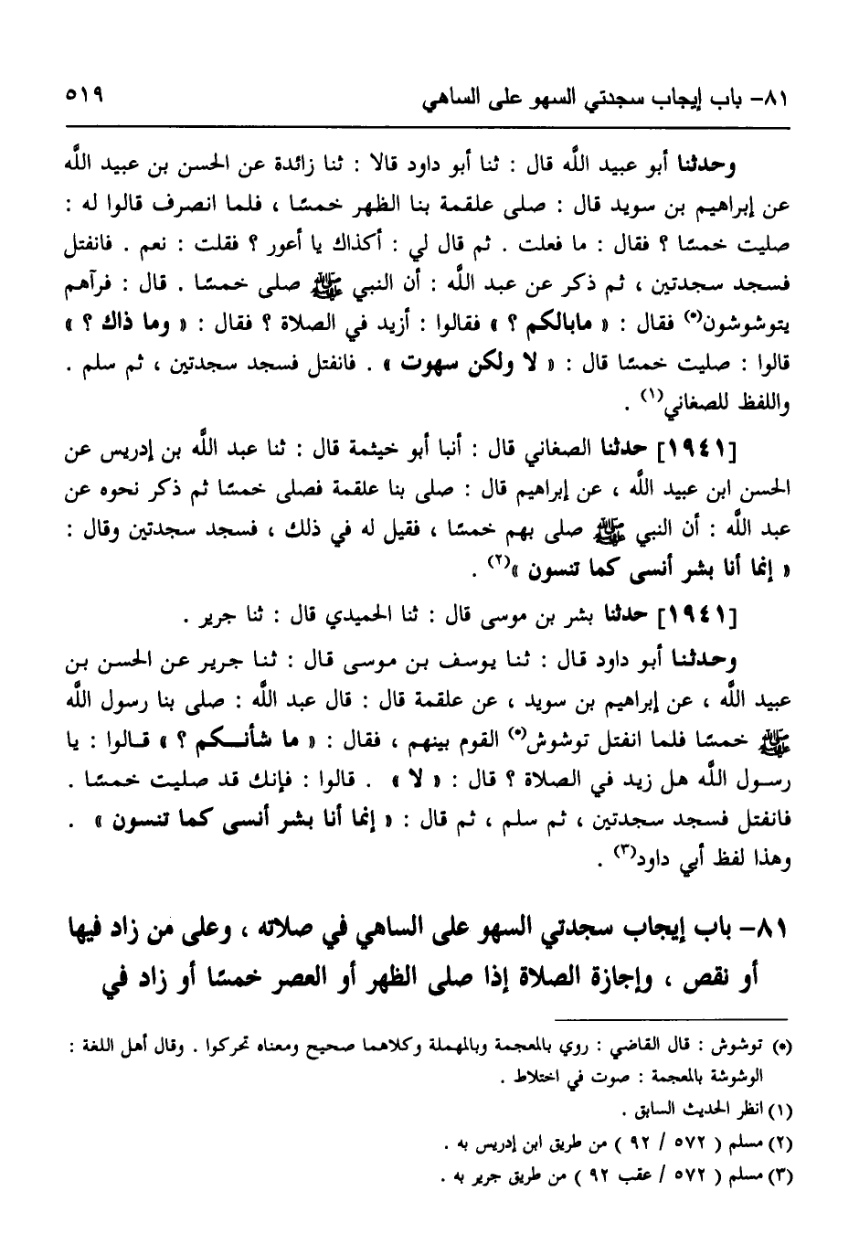 حَدَّثَنَا بِشْرُ بْنُ مُوسَى قَالَ: ثَنَا الْحُمَيْدِيُّ قَالَ: ثَنَا جَرِيرٌ، وَحَدَّثَنَا أَبُو دَاوُدَ قَالَ: ثَنَا يُوسُفُ بْنُ مُوسَى قَالَ: ثَنَا جَرِيرٌ، عَنِ الْحَسَنِ بْنِ عُبَيْدِ اللَّهِ، عَنْ إِبْرَاهِيمَ بْنِ سُوَيْدٍ، عَنْ عَلْقَمَةَ قَالَ: قَالَ عَبْدُ اللَّهِ " §صَلَّى بِنَا رَسُولُ اللَّهِ صَلَّى اللهُ عَلَيْهِ وَسَلَّمَ خَمْسًا، فَلَمَّا انْفَتَلَ تَوَشْوَشَ الْقَوْمُ بَيْنَهُمْ، فَقَالَ: «مَا شَأْنُكُمْ؟» قَالُوا: يَا رَسُولَ اللَّهِ هَلْ زِيدَ فِي الصَّلَاةِ؟ قَالَ: «لَا» ، قَالُوا: فَإِنَّكَ قَدْ صَلَّيْتَ خَمْسًا، فَانْفَتَلَ فَسَجَدَ سَجْدَتَيْنِ، ثُمَّ سَلَّمَ ثُمَّ قَالَ: «إِنَّمَا أَنَا بَشَرٌ أَنْسَى كَمَا تَنْسَوْنَ» وَهَذَا لَفْظُ أَبِي دَاوُدَ