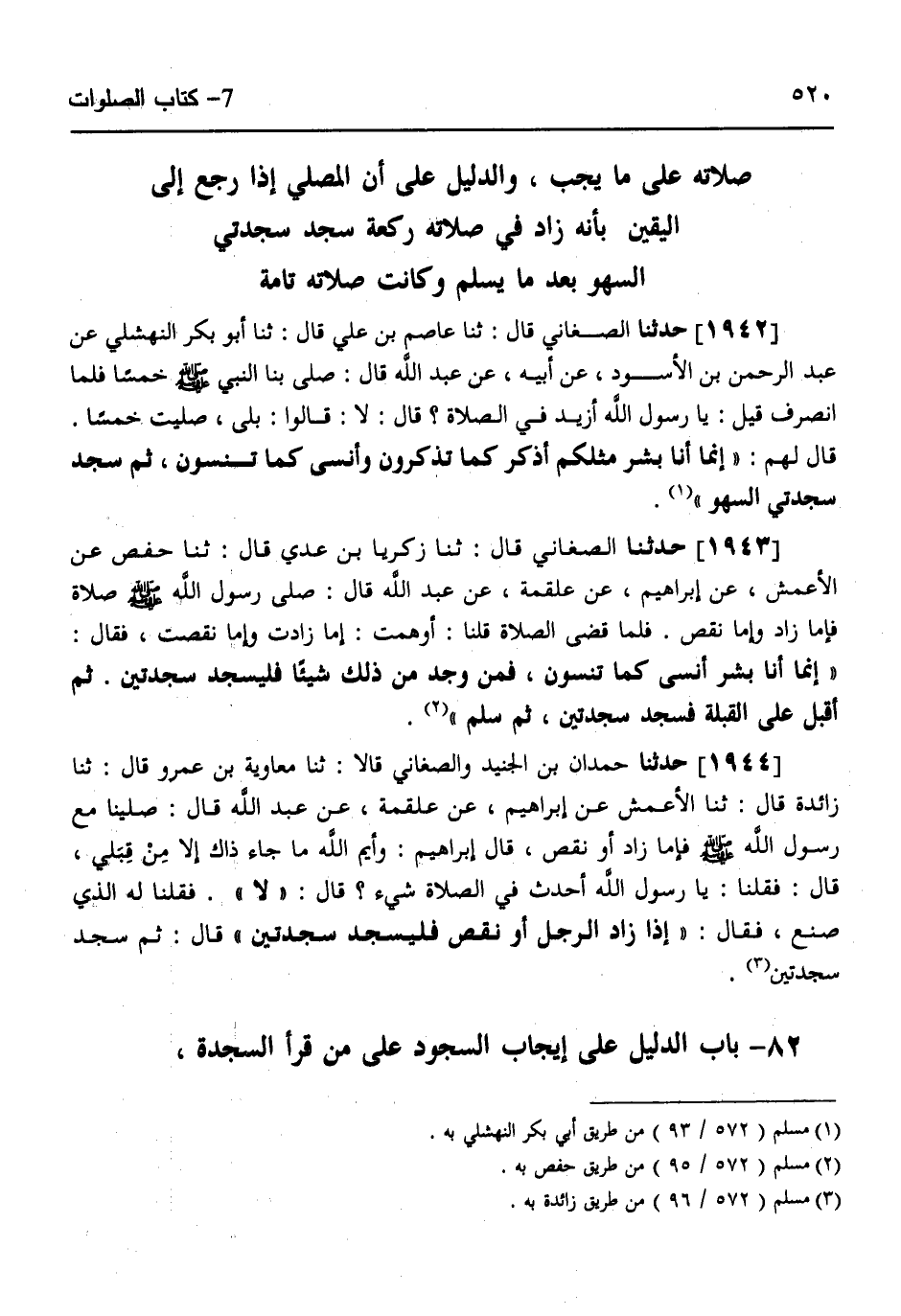 1943 - حَدَّثَنَا الصَّغَانِيُّ قَالَ: ثَنَا زَكَرِيَّا بْنُ عَدِيٍّ قَالَ: ثَنَا حَفْصٌ، عَنِ الْأَعْمَشِ، عَنْ إِبْرَاهِيمَ، عَنْ عَلْقَمَةَ، عَنْ عَبْدِ اللَّهِ قَالَ: صَلَّى رَسُولُ اللَّهِ صَلَّى اللهُ عَلَيْهِ وَسَلَّمَ صَلَاةً - فَإِمَّا زَادَ وَإِمَّا نَقَصَ - فَلَمَّا قَضَى الصَّلَاةَ قُلْنَا أَوْهَمْتَ إِمَّا زَادَتْ وَإِمَّا نَقَصَتْ، فَقَالَ: «§إِنَّمَا أَنَا بَشَرٌ أَنْسَى كَمَا تَنْسَوْنَ، فَمَنْ وَجَدَ مِنْ ذَلِكَ شَيْئًا فَلْيَسْجُدْ سَجْدَتَيْنِ، ثُمَّ أَقْبَلَ عَلَى الْقِبْلَةِ فَسَجَدَ سَجْدَتَيْنِ، ثُمَّ سَلَّمَ»