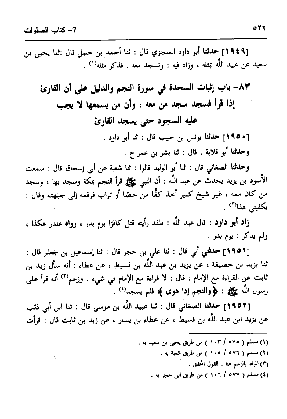 1950 - حَدَّثَنَا يُونُسُ بْنُ حَبِيبٍ قَالَ: ثَنَا أَبُو دَاوُدَ، وَحَدَّثَنَا أَبُو قِلَابَةَ قَالَ: ثَنَا بِشْرُ بْنُ عُمَرَ، ح. وَحَدَّثَنَا الصَّغَانِيُّ قَالَ: ثَنَا أَبُو الْوَلِيدِ قَالُوا: ثَنَا شُعْبَةُ، عَنْ أَبِي إِسْحَاقَ قَالَ: سَمِعْتُ الْأَسْوَدَ بْنَ يَزِيدَ يُحَدِّثُ، عَنْ عَبْدِ اللَّهِ، أَنَّ النَّبِيَّ صَلَّى اللهُ عَلَيْهِ وَسَلَّمَ «§قَرَأَ النَّجْمَ بِمَكَّةَ وَسَجَدَ بِهَا وَسَجَدَ مَنْ كَانَ مَعَهُ غَيْرَ شَيْخٍ كَبِيرٍ أَخَذَ كَفًّا مِنْ حَصًا أَوْ تُرَابٍ فَرَفَعَهُ إِلَى جَبْهَتِهِ وَقَالَ يَكْفِينِي هَذَا» زَادَ أَبُو دَاوُدَ قَالَ عَبْدُ اللَّهِ: فَلَقَدْ رَأَيْتُهُ قُتِلَ كَافِرًا يَوْمَ بَدْرٍ. رَوَاهُ غُنْدَرٌ هَكَذَا وَلَمْ يَذْكُرْ يَوْمَ بَدْرٍ