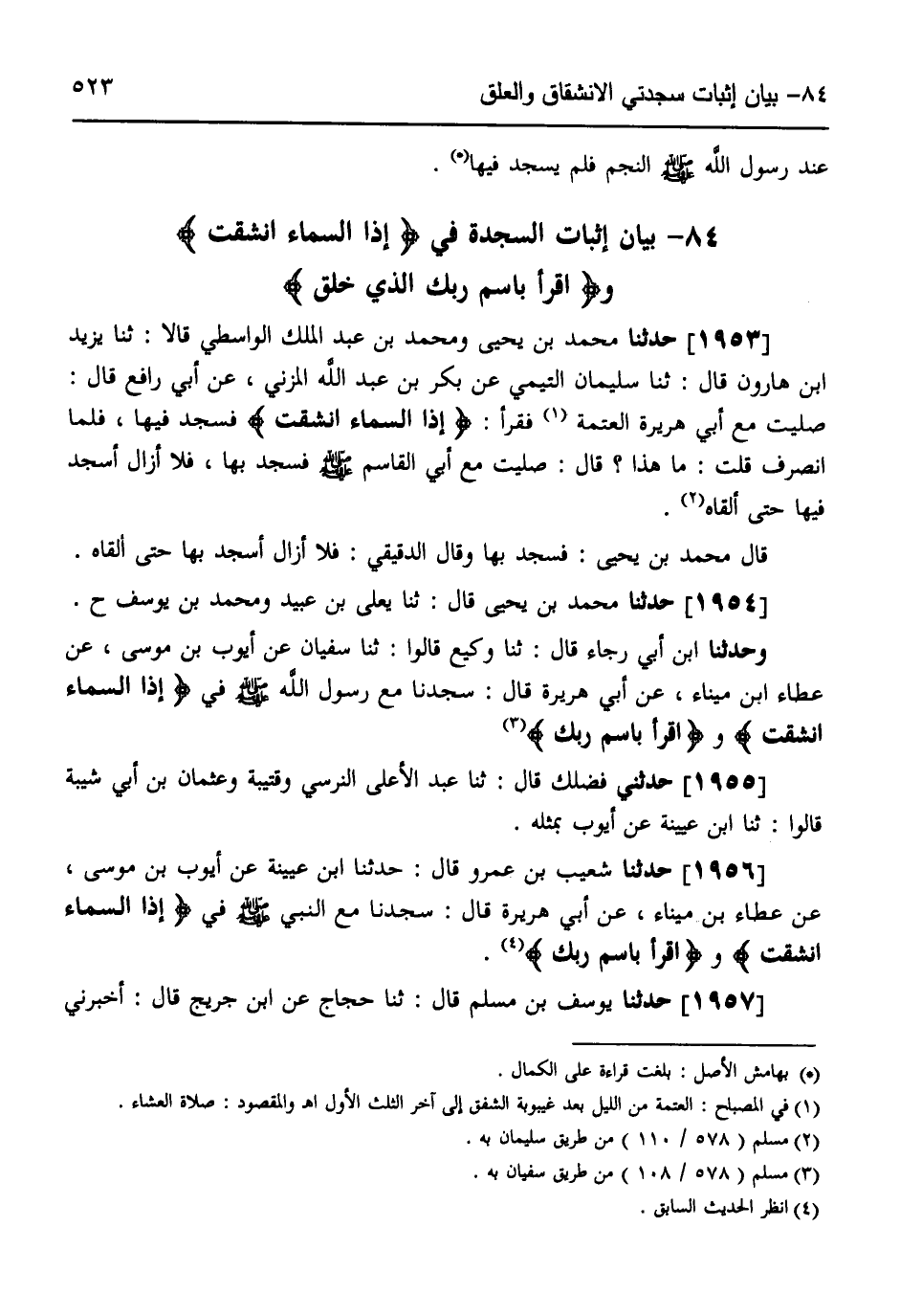 1956 - حَدَّثَنَا شُعَيْبُ بْنُ عَمْرٍو قَالَ: حَدَّثَنَا ابْنُ عُيَيْنَةَ، عَنْ أَيُّوبَ بْنِ مُوسَى، عَنْ عَطَاءِ بْنِ مِينَاءَ، عَنْ أَبِي هُرَيْرَةَ قَالَ: «§سَجَدْنَا مَعَ النَّبِيِّ صَلَّى اللهُ عَلَيْهِ وَسَلَّمَ فِي إِذَا السَّمَاءُ انْشَقَّتْ وَاقْرَأْ بِاسْمِ رَبِّكَ»