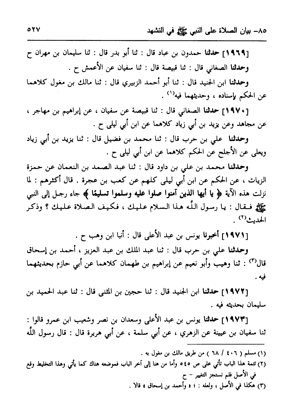 1970 - حَدَّثَنَا الصَّغَانِيُّ قَالَ: ثَنَا قَبِيصَةُ، عَنْ سُفْيَانَ، عَنْ إِبْرَاهِيمَ بْنِ مُهَاجِرٍ، عَنْ مُجَاهِدٍ، وَعَنْ يَزِيدَ بْنِ أَبِي زِيَادٍ، كِلَاهُمَا، عَنِ ابْنِ أَبِي لَيْلَى، ح. وَحَدَّثَنَا عَلِيُّ بْنُ حَرْبٍ قَالَ: ثَنَا مُحَمَّدُ بْنُ فُضَيْلٍ قَالَ: ثَنَا يَزِيدُ بْنُ أَبِي زِيَادٍ، وَيَعْلَى، عَنِ الْأَجْلَحِ، عَنِ الْحَكَمِ كِلَاهُمَا، عَنِ ابْنِ أَبِي لَيْلَى، ح. وَحَدَّثَنَا مُحَمَّدُ بْنُ عَلِيِّ بْنِ دَاوُدَ قَالَ: ثَنَا عَبْدُ الصَّمَدِ بْنُ النُّعْمَانِ، عَنْ حَمْزَةَ الزَّيَّاتِ، عَنِ الْحَكَمِ، عَنِ ابْنِ أَبِي لَيْلَى كُلُّهُمْ، عَنْ كَعْبِ بْنِ عُجْرَةَ قَالَ أَكْثَرَهُمْ: " §لَمَّا نَزَلَتْ هَذِهِ الْآيَةُ {يَا أَيُّهَا الَّذِينَ آمَنُوا صَلُّوا عَلَيْهِ وَسَلِّمُوا تَسْلِيمًا} [الأحزاب: 56] جَاءَ رَجُلٌ إِلَى النَّبِيِّ صَلَّى اللهُ عَلَيْهِ وَسَلَّمَ، فَقَالَ: يَا رَسُولَ اللَّهِ هَذَا السَّلَامُ عَلَيْكَ فَكَيْفَ الصَّلَاةُ عَلَيْكَ؟ " وَذَكَرَ الْحَدِيثَ.