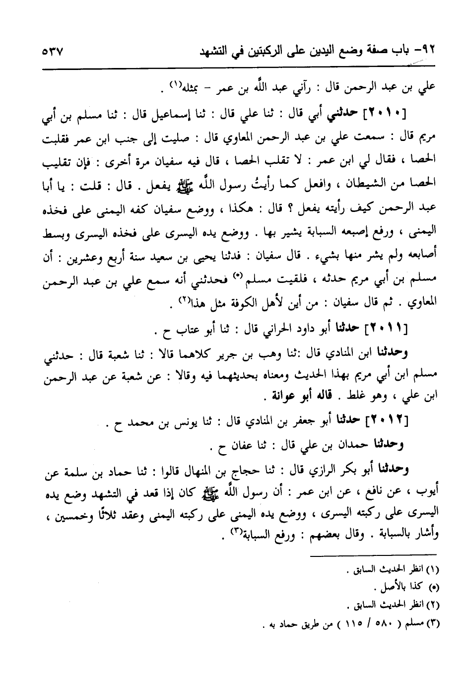 2012 - حَدَّثَنَا أَبُو جَعْفَرِ بْنُ الْمُنَادِي قَالَ: ثَنَا يُونُسُ بْنُ مُحَمَّدٍ، ح. وَحَدَّثَنَا حَمْدَانُ بْنُ عَلِيٍّ قَالَ: ثَنَا عَفَّانُ، ح. وَحَدَّثَنَا أَبُو بَكْرٍ الرَّازِيُّ قَالَ: ثَنَا حَجَّاجُ بْنُ الْمِنْهَالِ قَالُوا: ثَنَا حَمَّادُ بْنُ سَلَمَةَ، عَنْ أَيُّوبَ، عَنْ نَافِعٍ، عَنِ ابْنِ عُمَرَ، «أَنَّ رَسُولَ اللَّهِ صَلَّى اللهُ عَلَيْهِ وَسَلَّمَ كَانَ §إِذَا قَعَدَ فِي التَّشَهُّدِ وَضَعَ يَدَهُ الْيُسْرَى عَلَى رُكْبَتِهِ الْيُسْرَى، وَوَضَعَ يَدَهُ الْيُمْنَى عَلَى رُكْبَتِهِ الْيُمْنَى، وَعَقَدَ ثَلَاثًا وَخَمْسِينَ، وَأَشَارَ بِالسَّبَّابَةِ» وَقَالَ بَعْضُهُمْ وَرَفَعَ السَّبَّابَةَ -[538]-.