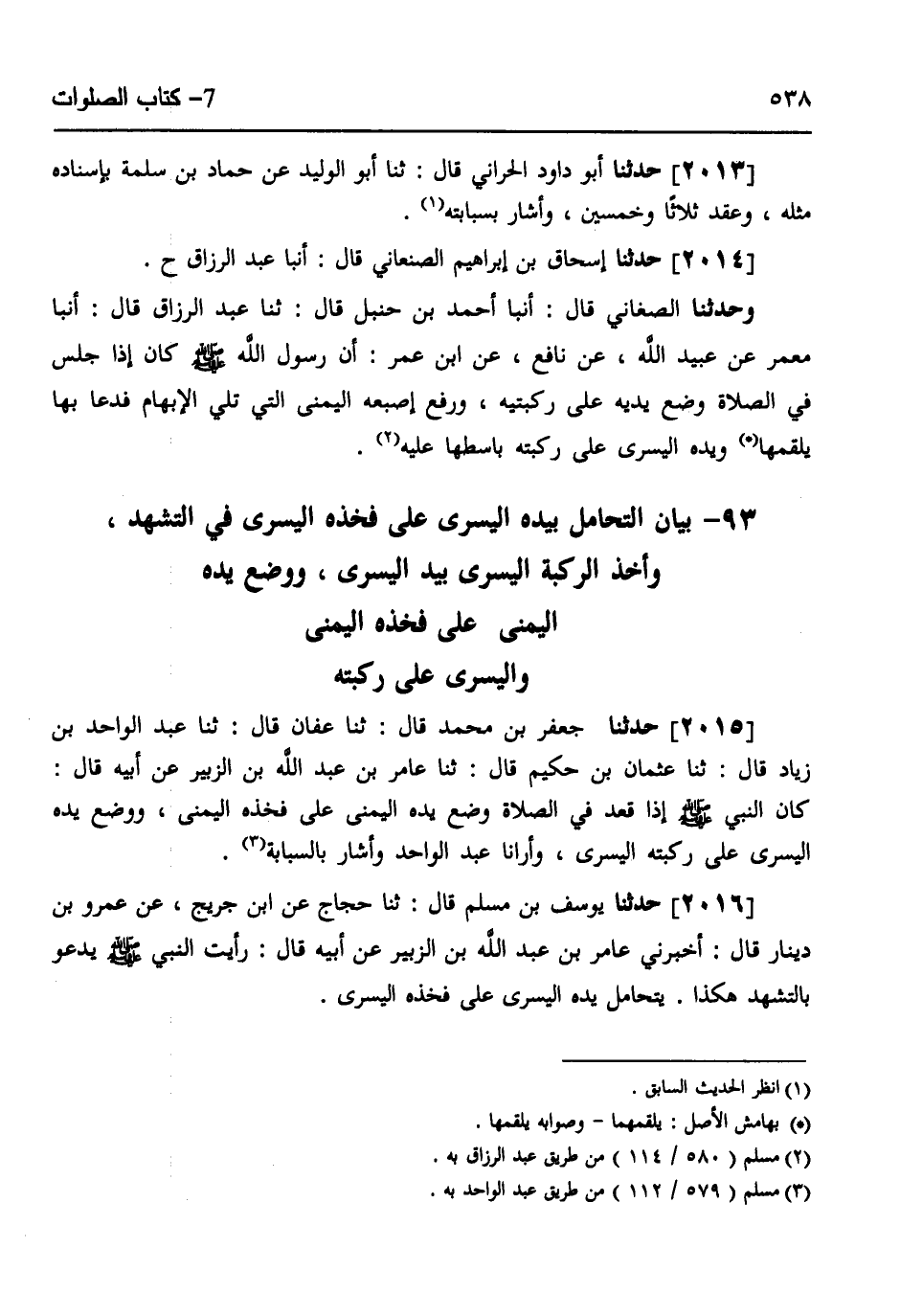2014 - حَدَّثَنَا إِسْحَاقُ بْنُ إِبْرَاهِيمَ الصَّنْعَانِيُّ قَالَ: أنبا عَبْدُ الرَّزَّاقِ، ح. وَحَدَّثَنَا الصَّغَانِيُّ قَالَ: أنبا أَحْمَدُ بْنُ حَنْبَلٍ قَالَ: ثَنَا عَبْدُ الرَّزَّاقِ قَالَ: أنبا مَعْمَرٌ، عَنْ عُبَيْدِ اللَّهِ، عَنْ نَافِعٍ، عَنِ ابْنِ عُمَرَ، «أَنَّ رَسُولَ اللَّهِ صَلَّى اللهُ عَلَيْهِ وَسَلَّمَ كَانَ §إِذَا جَلَسَ فِي الصَّلَاةِ وَضَعَ يَدَيْهِ عَلَى رُكْبَتَيْهِ وَرَفَعَ إِصْبَعَهُ الْيُمْنَى الَّتِي تَلِي الْإِبْهَامَ، فَدَعَا بِهَا يُلْقِمُهَا وَيَدُهُ الْيُسْرَى عَلَى رُكْبَتِهِ بَاسِطَهَا عَلَيْهِ»
