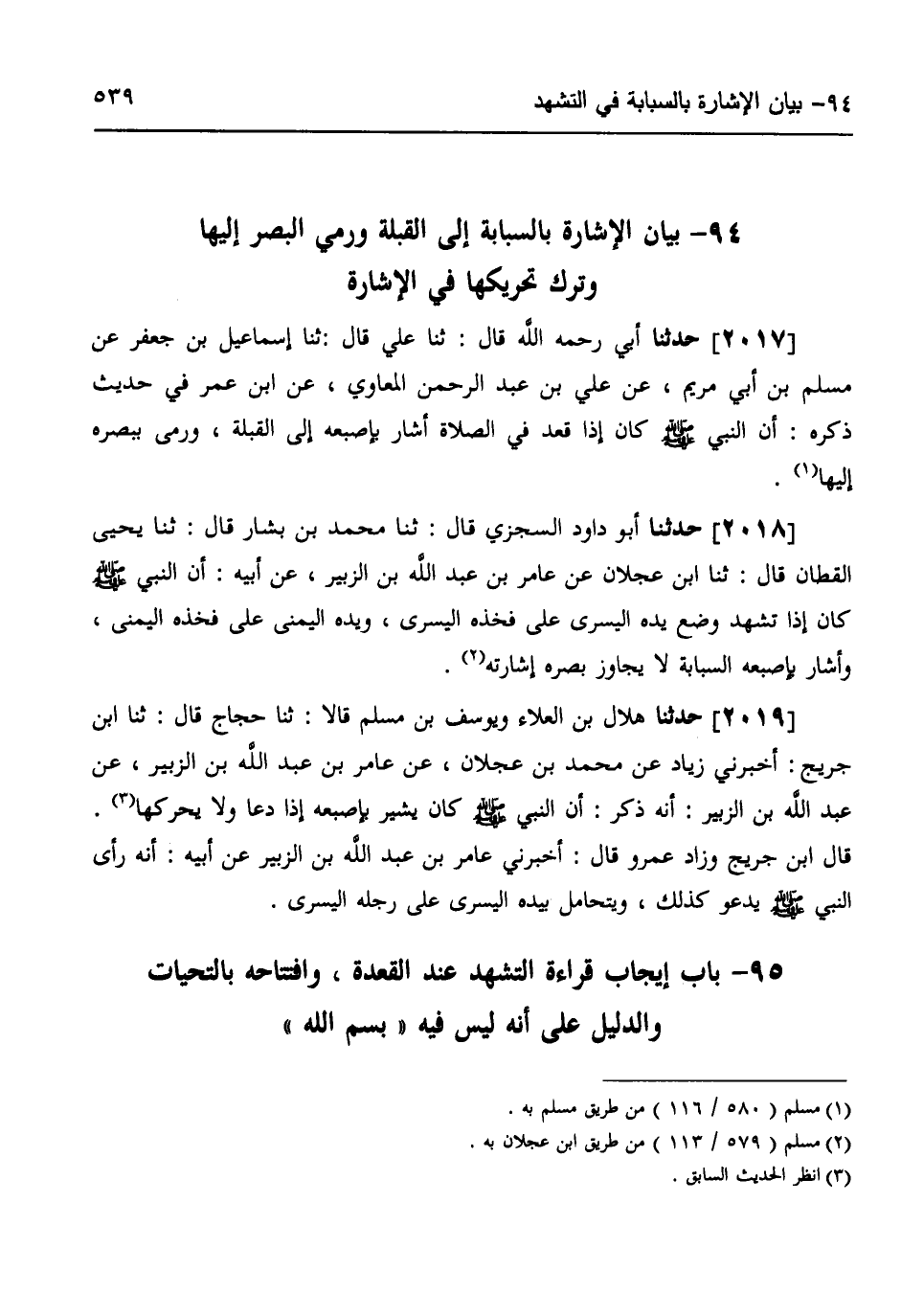 2017 - حَدَّثَنَا أَبِي رَحِمَهُ اللَّهُ قَالَ: ثَنَا عَلِيٌّ قَالَ: ثَنَا إِسْمَاعِيلُ بْنُ جَعْفَرٍ، عَنْ مُسْلِمِ بْنِ أَبِي مَرْيَمَ، عَنْ عَلِيِّ بْنِ عَبْدِ الرَّحْمَنِ الْمُعَاوِيِّ، عَنِ ابْنِ عُمَرَ فِي حَدِيثٍ ذَكَرَهُ، «أَنَّ النَّبِيَّ صَلَّى اللهُ عَلَيْهِ وَسَلَّمَ كَانَ §إِذَا قَعَدَ فِي الصَّلَاةِ أَشَارَ بِإِصْبَعِهِ إِلَى الْقِبْلَةِ وَرَمَى بِبَصَرِهِ إِلَيْهَا»