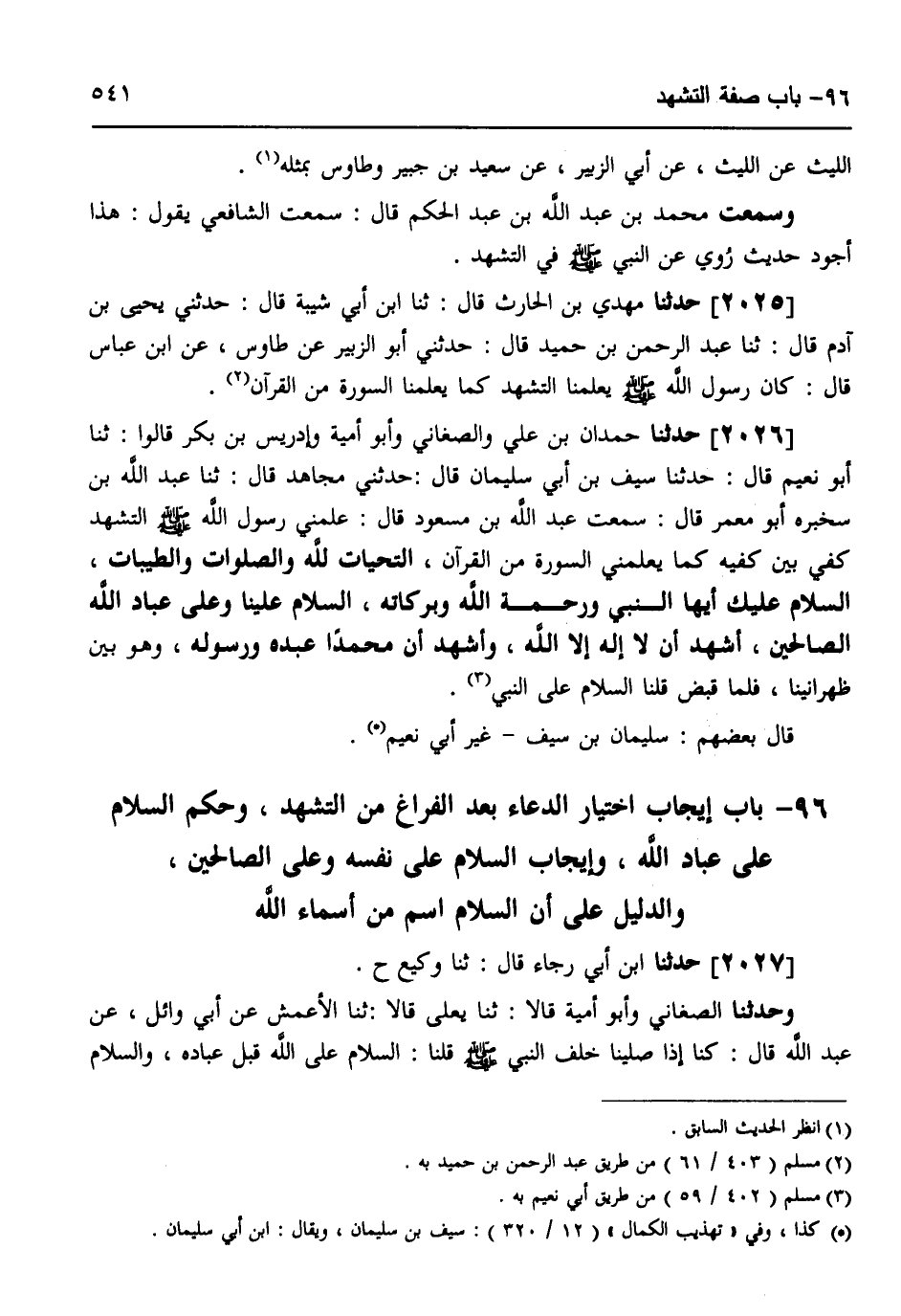 2026 - حَدَّثَنَا حَمْدَانُ بْنُ عَلِيٍّ وَالصَّغَانِيُّ، وَأَبُو أُمَيَّةَ، وَإِدْرِيسُ بْنُ بَكْرٍ قَالُوا: ثَنَا أَبُو نُعَيْمٍ قَالَ: حَدَّثَنَا سَيْفُ بْنُ أَبِي سُلَيْمَانَ قَالَ: حَدَّثَنِي مُجَاهِدٌ قَالَ: ثَنَا عَبْدُ اللَّهِ بْنُ سَخْبَرَةَ أَبُو مَعْمَرٍ قَالَ: سَمِعْتُ عَبْدَ اللَّهِ بْنَ مَسْعُودٍ قَالَ: " §عَلِّمْنِي رَسُولُ اللَّهِ صَلَّى اللهُ عَلَيْهِ وَسَلَّمَ التَّشَهُّدَ كَفِّي بَيْنَ كَفَّيْهِ كَمَا يُعَلِّمُنِي السُّورَةَ مِنَ الْقُرْآنِ: التَّحِيَّاتُ لِلَّهِ وَالصَّلَوَاتُ وَالطَّيِّبَاتُ، السَّلَامُ عَلَيْكَ أَيُّهَا النَّبِيُّ وَرَحْمَةُ اللَّهِ وَبَرَكَاتُهُ، السَّلَامُ عَلَيْنَا وَعَلَى عِبَادِ اللَّهِ الصَّالِحِينَ، أَشْهَدُ أَنْ لَا إِلَهَ إِلَّا اللَّهُ وَأَشْهَدُ أَنَّ مُحَمَّدًا عَبْدُهُ وَرَسُولُهُ " وَهُوَ بَيْنَ ظَهْرَانَيْنَا، فَلَمَّا قُبِضَ قُلْنَا: السَّلَامُ عَلَى النَّبِيِّ. قَالَ بَعْضُهُمْ: سُلَيْمَانُ بْنُ سَيْفٍ غَيْرُ أَبِي نُعَيْمٍ
