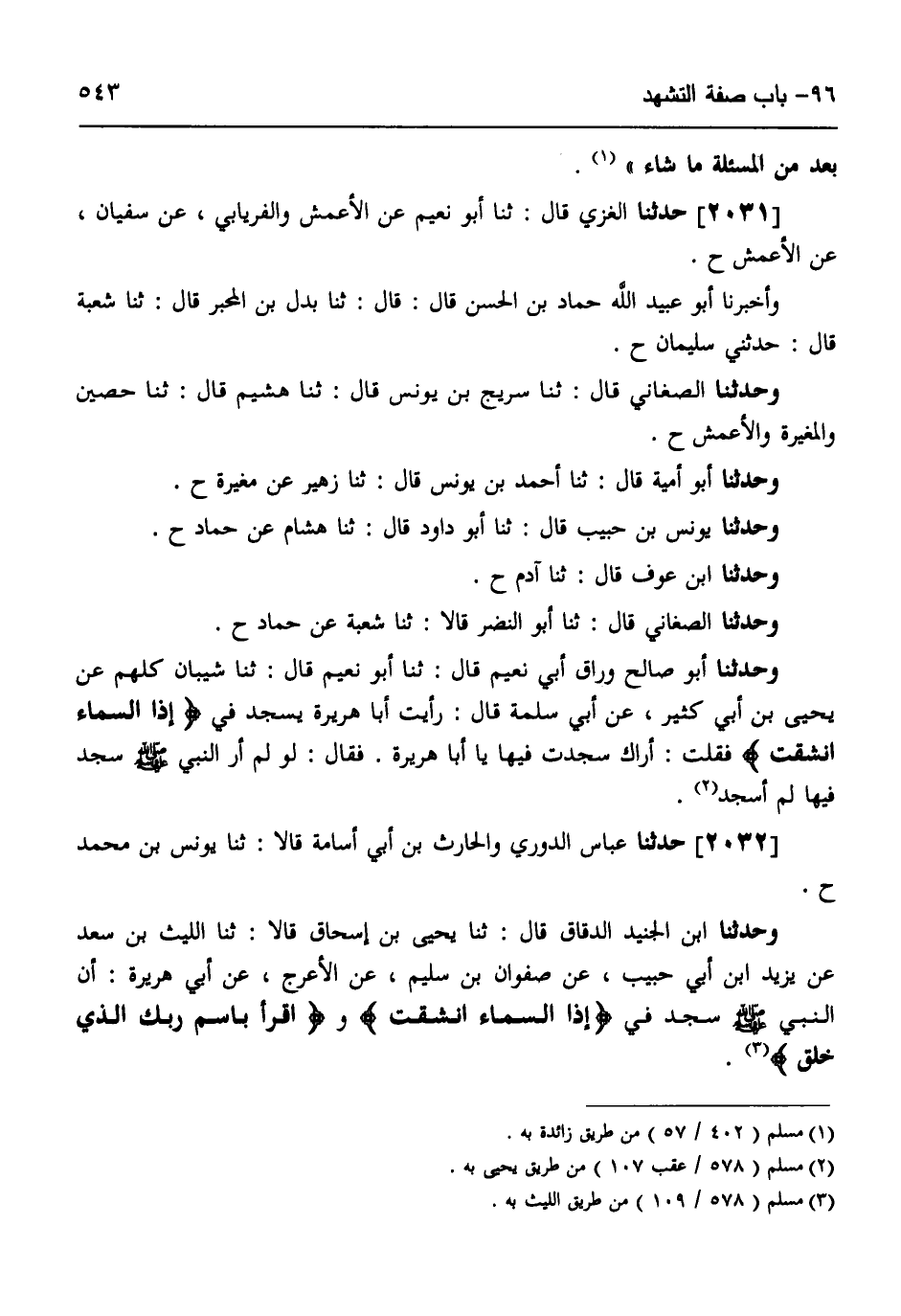 2031 - حَدَّثَنَا الْغَزِّيُّ قَالَ: ثَنَا أَبُو نُعَيْمٍ، عَنِ الْأَعْمَشِ، وَالْفِرْيَابِيُّ، عَنْ سُفْيَانَ، عَنِ الْأَعْمَشِ، ح. وَأَخْبَرَنَا أَبُو عُبَيْدِ اللَّهِ حَمَّادُ بْنُ الْحَسَنِ قَالَ: قَالَ ثَنَا بَدَلُ بْنُ الْمُحَبَّرِ قَالَ: ثَنَا شُعْبَةُ قَالَ: حَدَّثَنِي سُلَيْمَانُ، ح. وَحَدَّثَنَا الصَّغَانِيُّ قَالَ: ثَنَا سُرَيْجُ بْنُ يُونُسَ قَالَ: ثَنَا هُشَيْمٌ قَالَ: ثَنَا حُصَيْنٌ، وَالْمُغِيرَةُ، وَالْأَعْمَشُ، ح. وَحَدَّثَنَا أَبُو أُمَيَّةَ قَالَ: ثَنَا أَحْمَدُ بْنُ يُونُسَ قَالَ: ثَنَا زُهَيْرٌ، عَنْ مُغِيرَةَ، ح. وَحَدَّثَنَا يُونُسُ بْنُ حَبِيبٍ قَالَ: ثَنَا أَبُو دَاوُدَ قَالَ: ثَنَا هِشَامٌ، عَنْ حَمَّادٍ، ح. وَحَدَّثَنَا ابْنُ عَوْفٍ، ثَنَا آدَمُ ح. وَحَدَّثَنَا الصَّغَانِيُّ قَالَ: ثَنَا أَبُو النَّضْرِ قَالَا: ثَنَا شُعْبَةُ، عَنْ حَمَّادٍ ح. وَحَدَّثَنَا أَبُو صَالِحٍ، وَرَّاقُ أَبِي نُعَيْمٍ قَالَ: ثَنَا أَبُو نُعَيْمٍ قَالَ: ثَنَا شَيْبَانُ كُلُّهُمْ، عَنْ يَحْيَى بْنِ أَبِي كَثِيرٍ، عَنْ أَبِي سَلَمَةَ قَالَ: رَأَيْتُ أَبَا هُرَيْرَةَ " §يَسْجُدُ فِي إِذَا السَّمَاءُ انْشَقَّتْ فَقُلْتُ: أَرَاكَ سَجَدْتَ فِيهَا يَا أَبَا هُرَيْرَةَ، فَقَالَ: لَوْ لَمْ أَرَ النَّبِيَّ صَلَّى اللهُ عَلَيْهِ وَسَلَّمَ سَجَدَ فِيهَا لَمْ أَسْجُدْ "