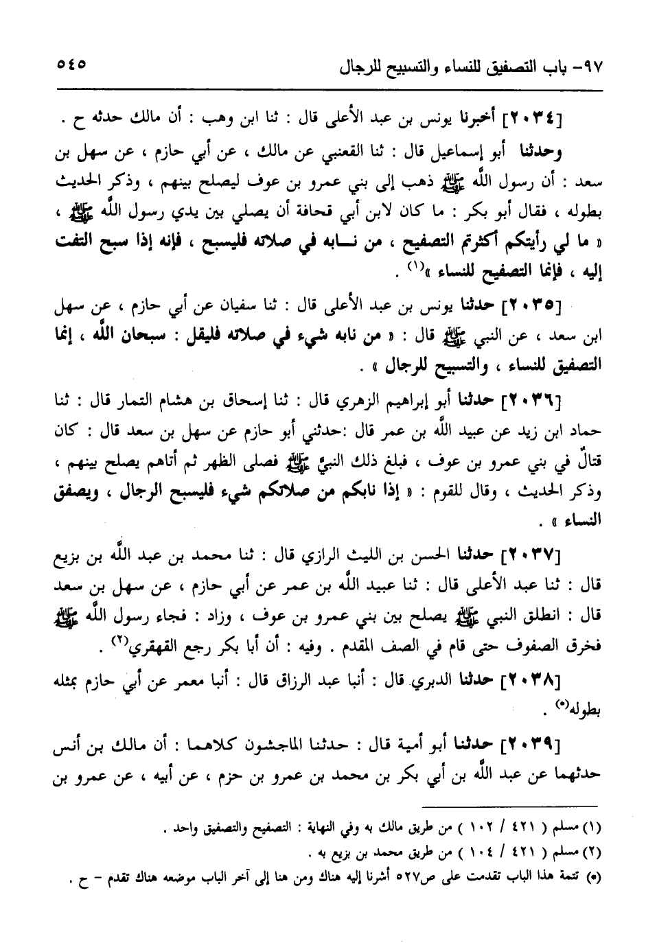 2036 - حَدَّثَنَا أَبُو إِبْرَاهِيمَ الزُّهْرِيُّ قَالَ: ثَنَا إِسْحَاقُ بْنُ هِشَامٍ التَّمَّارُ قَالَ: ثَنَا حَمَّادُ بْنُ زَيْدٍ، عَنْ عُبَيْدِ اللَّهِ بْنِ عُمَرَ قَالَ: حَدَّثَنِي أَبُو حَازِمٍ، عَنْ سَهْلِ بْنِ سَعْدٍ قَالَ: كَانَ قِتَالٌ فِي بَنِي عَمْرِو بْنِ عَوْفٍ، فَبَلَغَ ذَلِكَ النَّبِيَّ صَلَّى اللهُ عَلَيْهِ وَسَلَّمَ فَصَلَّى الظُّهْرَ، ثُمَّ أَتَاهُمْ يُصْلِحُ بَيْنَهُمْ. وَذَكَرَ الْحَدِيثَ وَقَالَ لِلْقَوْمُ: «§إِذَا نَابَكُمْ مِنْ صَلَاتِكُمْ شَيْءٌ فَلْيُسَبِّحِ الرِّجَالُ وَيُصَفِّقِ النِّسَاءُ»