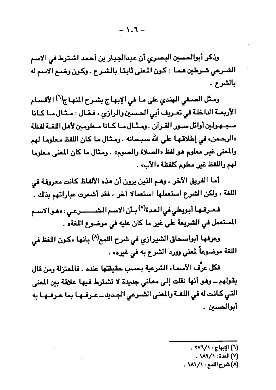 فكل عرف الأسماء الشرعية بحسب حقيقتها عنده. فالمعتزلة ومن قال بقولهم - وهو أنها نقلت إلى معاني جديدة لا تشترط فيها علاقة بين المعنى التي كانت له في اللغة والمعنى الشرعي الجديد - عرفها بما عرفها به أبو الحسين.