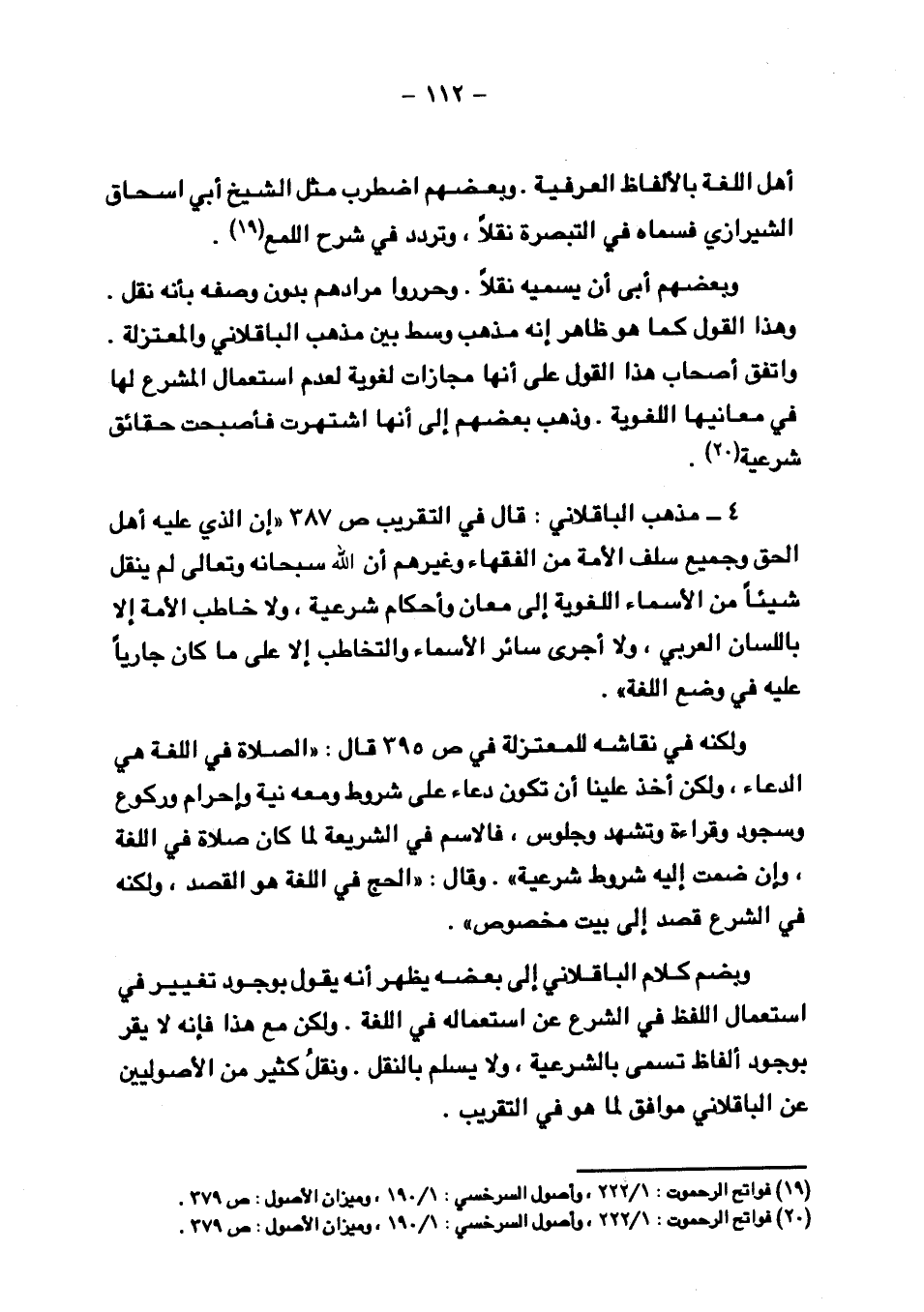 ولكنه في نقاشه للمعتزلة في ص ٣٩٥ قال: "الصلاة في اللغة هي الدعاء، ولكن أخذ علينا أن تكون دعاء على شروط ومعه نية وإحرام وركوع وسجود وقراءة وتشهد وجلوس، فالاسم في الشريعة لما كان صلاة في اللغة، وإن ضمت إليه شروط شرعية". وقال: "الحج في اللغة هو القصد، ولكنه في الشرع قصد إلى بيت مخصوص".