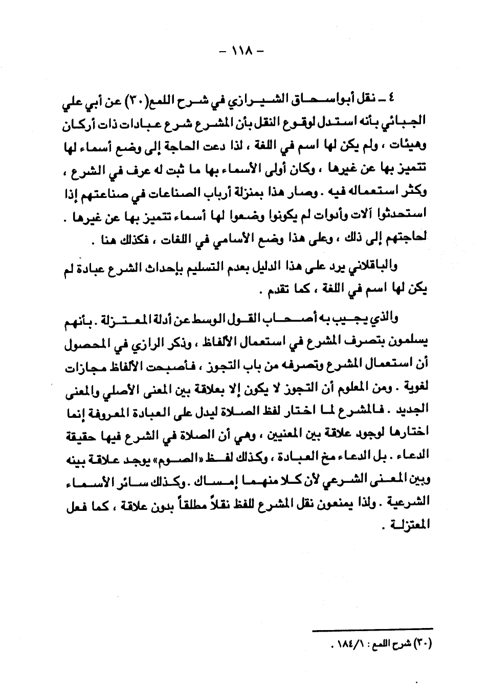 ٤ - نقل أبو إسحاق الشيرازي في شرح اللمع (٣٠) عن أبي علي الجبائي بأنه استدل لوقوع النقل بأن المشرع شرع عبادات ذات أركان وهيئات، ولم يكن لها اسم في اللغة، لذا دعت الحاجة إلى وضع أسماء لها تتميز بها عن غيرها، وكان أولى الأسماء بها ما ثبت له عرف في الشرع، وكثر استعماله فيه. وصار هذا بمنزلة أرباب الصناعات في صناعتهم إذا استحدثوا آلات وأدوات لم يكونوا وضعوا لها أسماء تتميز بها عن غيرها. لحاجتهم إلى ذلك، وعلى هذا وضع الأسامي في اللغات، فكذلك هنا.