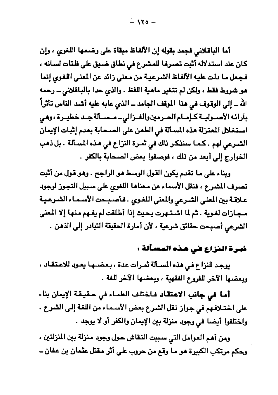 أما الباقلاني فجمد بقوله إن الألفاظ مبقاة على وضعها اللغوي، وإن كان عند استدلاله أثبت تصرفًا للمشرع في نطاق ضيق على فلتات لسانه، فجعل ما دلت عليه الألفاظ الشرعية من معنى زائد عن المعنى اللغوي إنما هو شروط فقط، ولكن لم تتغير ماهية اللفظ. والذي حدا بالباقلاني - رحمه الله - إلى الوقوف في هذا الموقف الجامد - الذي عابه عليه أشد الناس تأثرًا بآرائه الأصولية كإمام الحرمين والغزالي - مسألة جد خطيرة، وهي استغلال المعتزلة هذه المسألة في الطعن على الصحابة بعدم إثبات الإيمان الشرعي لهم. كما سنذكر ذلك في ثمرة النزاع في هذه المسألة. بل ذهب الخوارج إلى أبعد من ذلك، فوصفوا بعض الصحابة بالكفر.