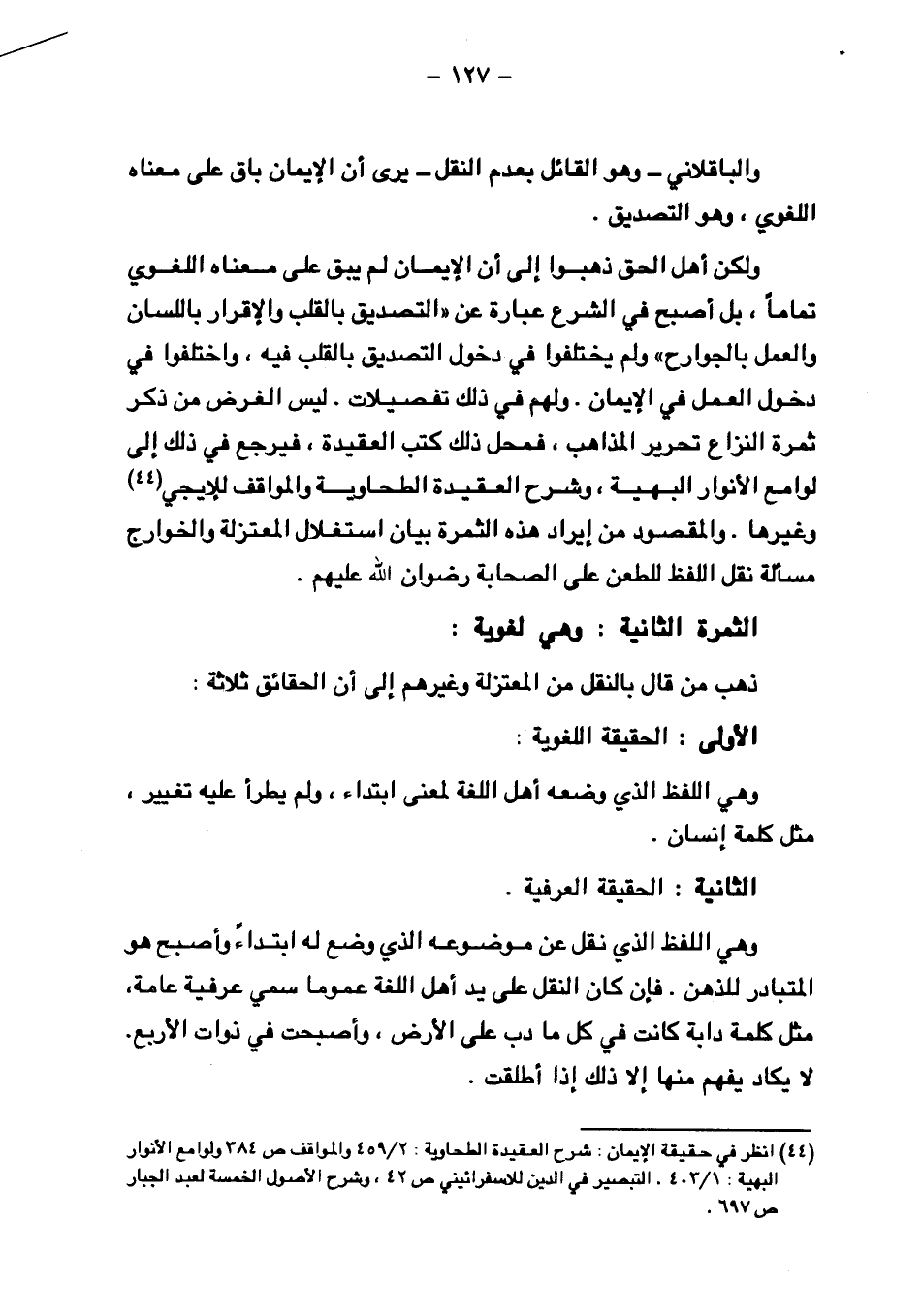 ولكن أهل الحق ذهبوا إلى أن الإيمان لم يبق على معناه اللغوي تمامًا، بل أصبح في الشرع عبارة عن "التصديق بالقلب والإقرار باللسان والعمل بالجوارح" ولم يختلفوا في دخول التصديق بالقلب فيه، واختلفوا في دخول العمل في الإيمان. ولهم في ذلك تفصيلات ليس الغرض من ذكر ثمرة النزاع تحرير المذاهب، فمحل ذلك كتب العقيدة، فيرجع في ذلك إلى لوامع الأنوار البهية، وشرح العقيدة الطحاوية والمواقف للإيجي وغيرها. والمقصود من إيراد هذه الثمرة بيان استغلال المعتزلة والخوارج مسألة نقل اللفظ للطعن على الصحابة رضوان الله عليهم.