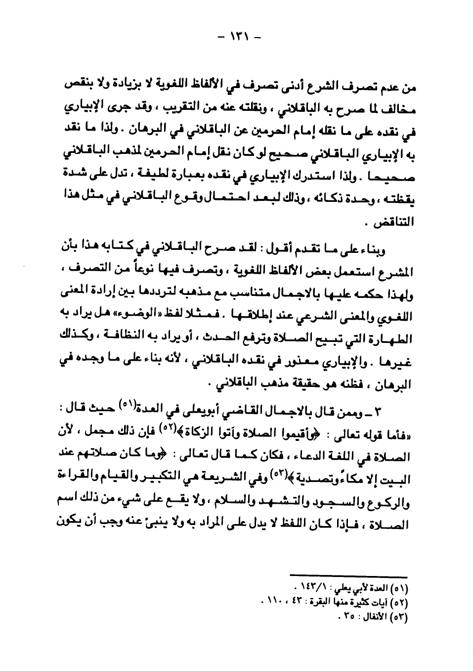 ٣ - وممن قال بالاجمال القاضي أبو يعلي في العدة حيث قال: "فأما قوله تعالى: {وأَقِيمُوا الصَّلاةَ وآتُوا الزَّكَاةَ} فإن ذلك مجمل، لأن الصلاة في اللغة الدعاء، فكان كما قال تعالى: {ومَا كَانَ صَلاتُهُمْ عِندَ البَيْتِ إلاَّ مُكَاءً وتَصْدِيَةً} وفي الشريعة هي التكبير والقيام والقراءة والركوع والسجود والتشهد والسلام، ولا يقع على شيء من ذلك اسم الصلاة، فإذا كان اللفظ لا يدل على المراد به ولا ينبئ عنه وجب أن يكون