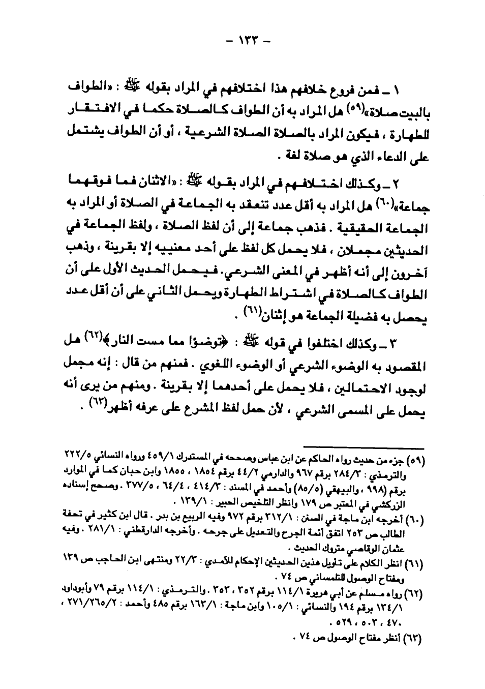 ٢ - وكذلك اختلافهم في المراد بقوله صلى الله عليه وسلم: "الاثنان فما فوقهما جماعة" هل المراد به أقل عدد تنعقد به الجماعة في الصلاة أو المراد به الجماعة الحقيقية. فذهب جماعة إلى أن لفظ الصلاة، ولفظ الجماعة في الحديثين مجملان، فلا يحمل كل لفظ على أحد معنييه إلا بقرينة، وذهب آخرون إلى أنه أظهر في المعنى الشرعي. فيحمل الحديث الأول على أن الطواف كالصلاة في اشتراط الطهارة ويحمل الثاني على أن أقل عدد يحصل به فضيلة الجماعة هو اثنان.
