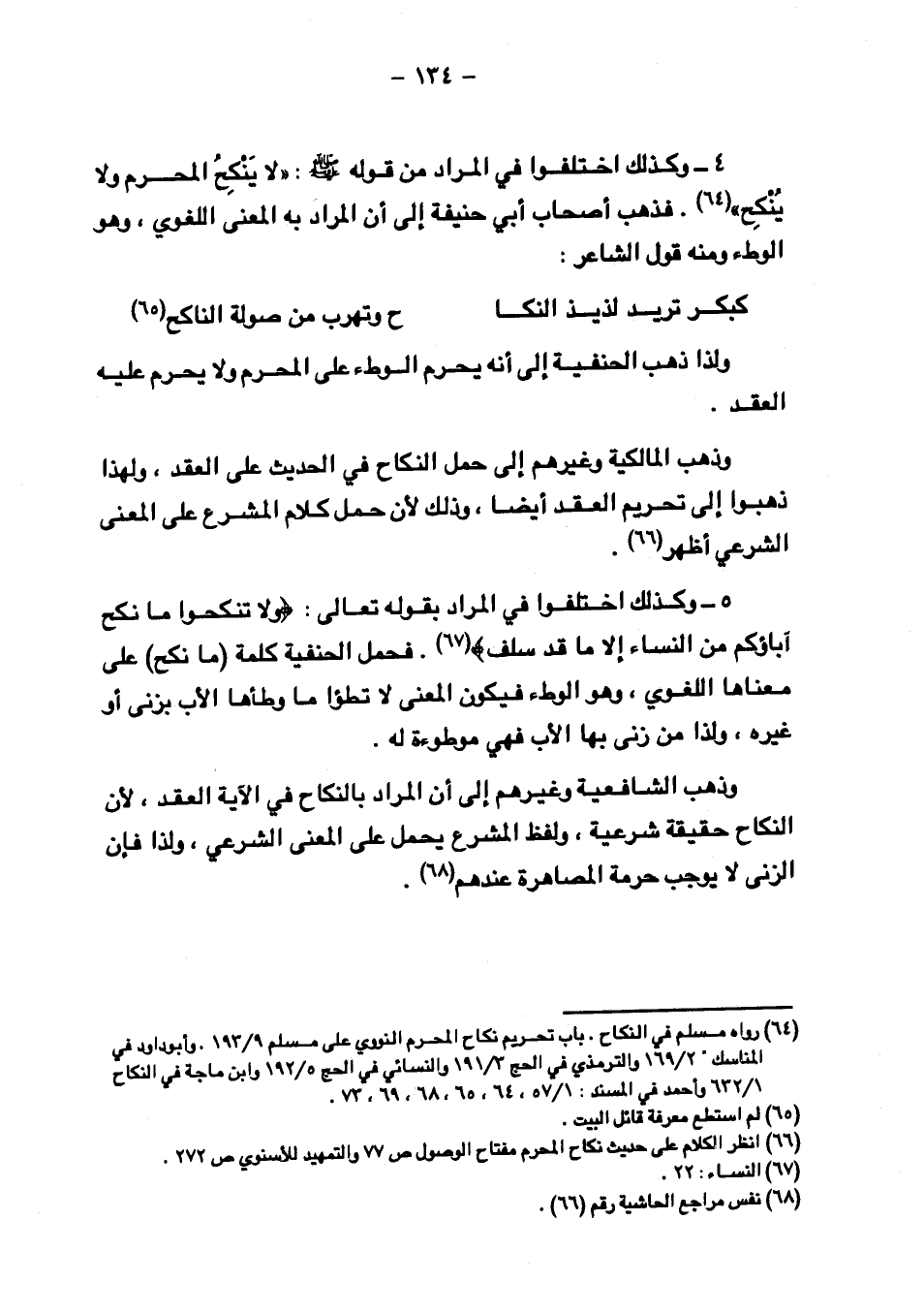 ٤ - وكذلك اختلفوا في المراد من قوله صلى الله عليه وسلم: "لا ينكح المحرم ولا ينكح". فذهب أصحاب أبي حنيفة إلى أن المراد به المعنى اللغوي، وهو الوطء ومنه قول الشاعر: