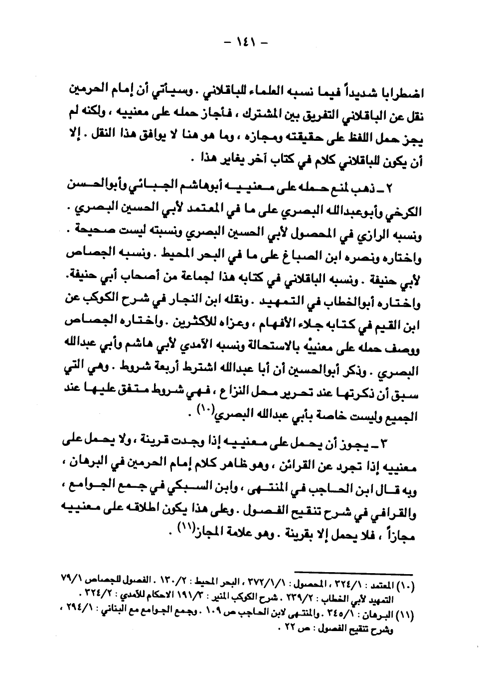 ٢ - ذهب لمنع حمله على معنييه أبو هاشم الجباني وأبو الحسن الكرخي وأبو عبد الله البصري على ما في المعتمد لأبي حسين البصري. ونسبة الرازي في المحصول لأبي حسين البصري ونسبته ليست صحيحةً. واختاره ونصره ابن الصباغ على ما في البحر المحيط. ونسبةً الجصاص لأبي حنيفةً. ونسبة الباقلاني في كتابه هذا لجماعة من أصحاب أبي حنيفة. واختاره أبو الخطاب في التمهيد. ونقله ابن النجار في شرح الكوكب عن ابن القيم في كتابه جلاء الافهام? وعزاء للاكثرين. واختاره الجصاص ووصف حمله على معنييه بالاستحالة ونسبة الأمدي لأبي هاشم وأبي عبد الله البصري. وذكر أبو الحسين أن أبا عبد الله اشترط أربعة شروط. وهي التي سبق أن ذكرتها عند تحرير محل النزاع? فهي شروط متفق عليها عند الجميع وليست خاصة بأبي عبد الله البصري.