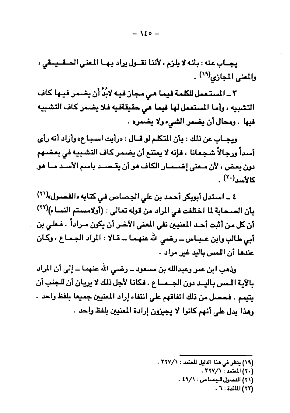 وذهب ابن عمرو وعبد الله بن مسعود - رضي الله عنهما - إلى أن المراد بالآية اللمس باليد دون الجماع. فكانا لآجل ذلك لا يريان أن للجنب أن يتيمم. فحصل من ذلك اتفاقهم على انتفاء إرادة المعنيين جميعًا بلفظ واحد. وهذا يدل على أنهم كانوا لا يجيزون إرادة المعنيين بلفظ واحد.