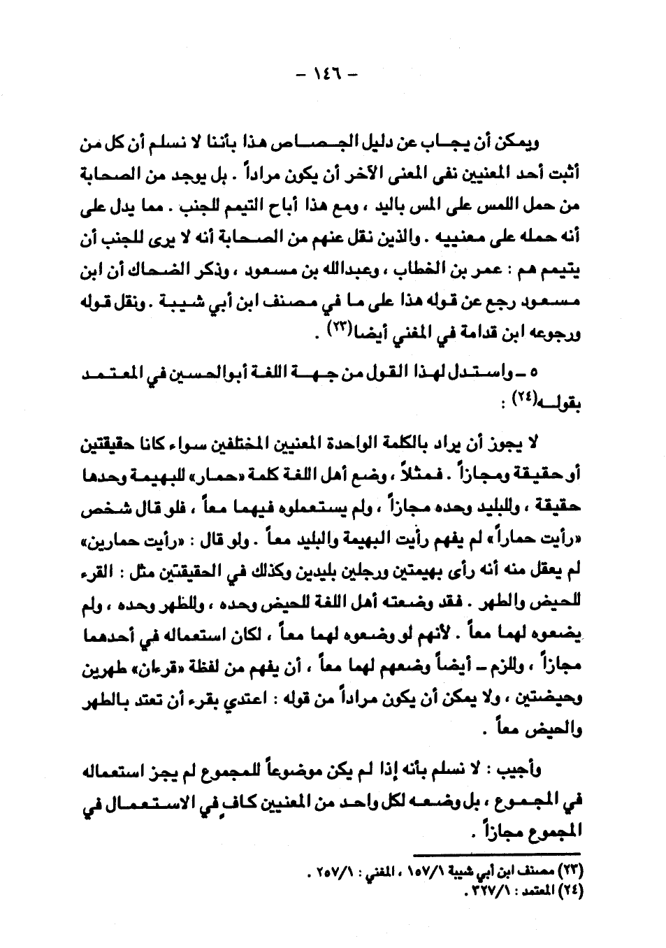 واستدل لهذا القول من جهة اللغةً أبو الحسين في المعتمد بقوله: لا يجوز أن يراد بالكلمة الواحدةً المعنيين المختلفين سواء كانا حقيقتين أو حقيقة ومجازًا. فمثلًا: وضع أهل اللغة كلمة ((حمار)) للبهيمةً وحدها حقيقةً? والبليد وحد مجازًا? ولم يستعملوه فيهما معًا. ولو قال: ((رأيت حمارين)) لم يعقل منه أنه رأى بهيمتين ورجلين بليدين وكذلك في الحقيقتين مثل: القرء للحيض والطهر. فقد وضعته أهل اللغة للحيض وحده? وللطهر وحده? ولم يضعوه لهما معًا. لأنهم لو وضعوه لهما معًا? لكان استعماله في أحدهما مجازًا. وللزم - أيضًا - وضعهم لهما معًا? أن يفهم من لفظةً ((قرءان)) طهرين وحيضتين? ولا يمكن أن يكون مرادًا من قوله: اعتدي بقرء أن تعتد بالطهر والحيض معًا.