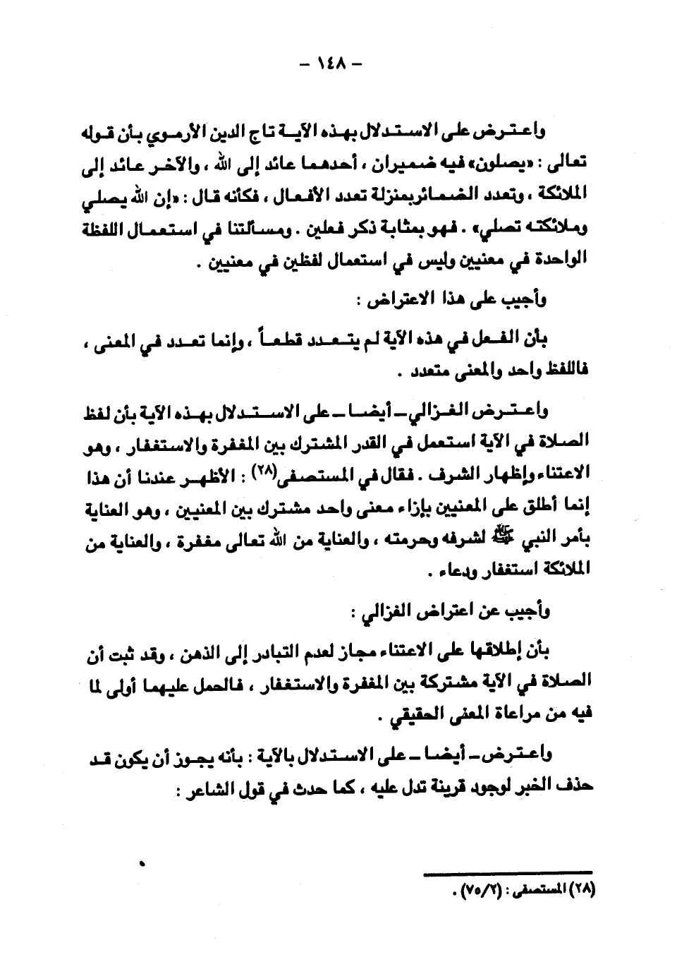 واعترض الغزالي - أيضًا - على الاستدلال بهذه الآيةً بأن لفظ الصلاةً في آلية استعمل في القدر المشترك بين المغفرةً والاستغفار? وهو الاعتناء وإظهار الشرف. فقال في المستصفي: الأظهر عندنا أن هذا إنما أطلق على المعنيين بإزاء معنى واحد مشترك بين المعنيين? وهو العناية بأمر النبي - صلى الله عليه وسلم - لشرفه وحرمته? والعناية من الله تعالى مغفرة? والعناية من الملائكة استغفار ودعاء.