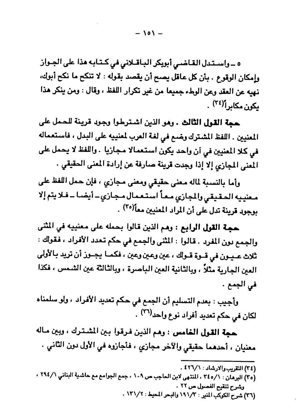 ٥ - واستدل القاضي أبو بكر الباقلاني في كتابه هذا على الجواز وإمكان الوقوع. بأن كل عاقل يصح أن يقصد بقوله: لا تنكح ما نكح أبوك? نهيه عن العقد وعن الوطء جميعا من غير تكرار اللفظ? وقال: ومن ينكر هذا يكون مكابرا.