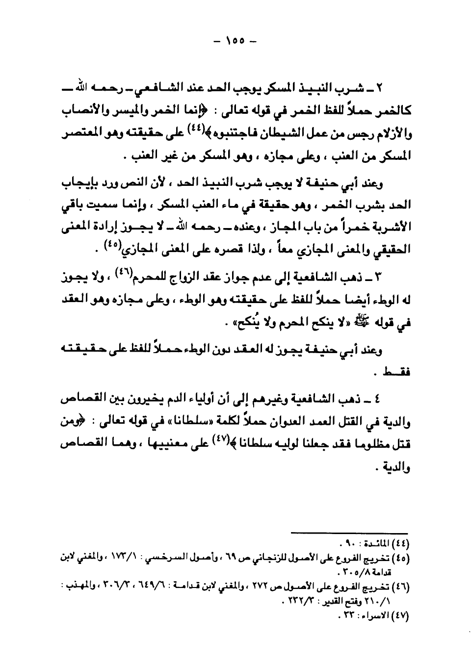 ٢ - شرب النبيذ المسكر يوجب الحد عند الشافعي - رحمه الله - كالخمر حملًا للفظ الخمر في قوله تعالى: {إِنَّمَا الْخَمْرُ وَالْمَيْسِرُ وَالأَنصَابُ وَالأَزْلاَمُ رِجْسٌ مِّنْ عَمَلِ الشَّيْطَانِ فَاجْتَنِبُوهُ} على حقيقته وهو المعتصر المسكر من العنب? وعلى مجازه? وهو المسكر من غير العنب.