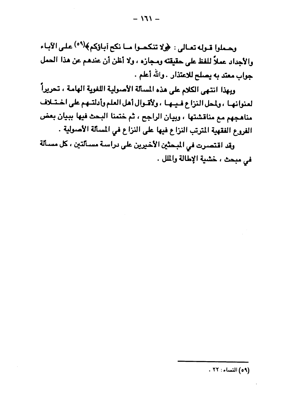 وبهذا انتهى الكلام على هذه المسالةً الأصوليةً اللغوية الهامة? تحريرًا لعنوانها? ولحل النزاع فيها? ولأقوال أهل العلم وأدلتهم على اختلاف مناهجهم? مع مناقشتها? وبيان الراجح? ثم ختمنا البحث فيها ببيان بعض الفروع الفقهية المترتب النزاع فيها على النزاع في المسالةً الأصوليةً.