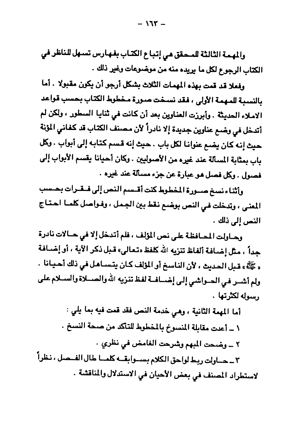 وفعلًا قد قمت بهذه المهمات الثلاث بشكل أرجو أن يكون مقبولًا. أما بالنسبة للمهمة الأولى? فقد نسخت صورة مخطوط الكتاب بحسب قواعد الإملاء الحديثة. وأبرزت العناوين بعد أن كانت في ثنايا السطور? ولكن لم أتدخل في وضع عناوين جديدة إلا نادرا لأن مصنف الكتاب قد كفاني المؤنةً حيث إنه كان يضع عنوانا لكل باب. حيث انه قسم كتابه إلى أبواب. وكل باب بمثابة المسالة عند غيره من الأصوليين. وكان أحيانا يقسم الأبواب إلى فصول. وكل فصل هو عبارة عن جزء مسالة عند غيره.