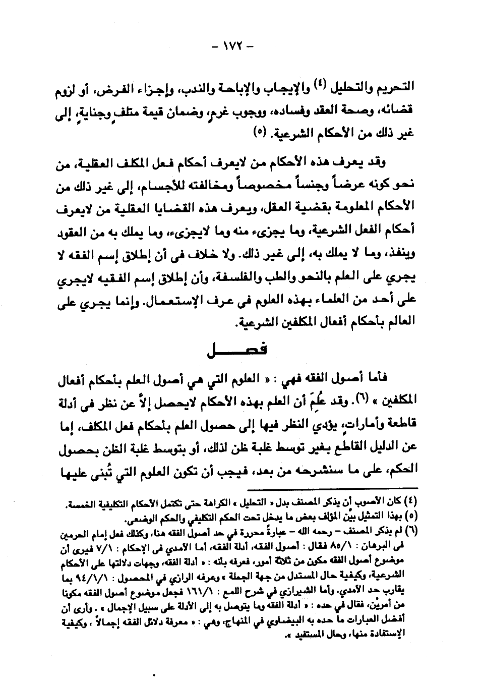 فأما أصول الفقه فهي: " العلوم التي هي أصول العلم بأحكام أفعال المكلفين". وقد علم أن العلم بهذه الأحكام لا يحصل إلا عن نظر في أدلة قاطعة وأمارات, يؤدي النظر فيها إلى حصول العلم بأحكام فعل المكلف, إما غن الدليل القاطع بغير توسط غلبة ظن ذلك, أو بتوسط غلبة الظن بحصول الحكم, على ما سنشرحه من بعد, فيجب أن تكون العلوم التي تبنى عليها