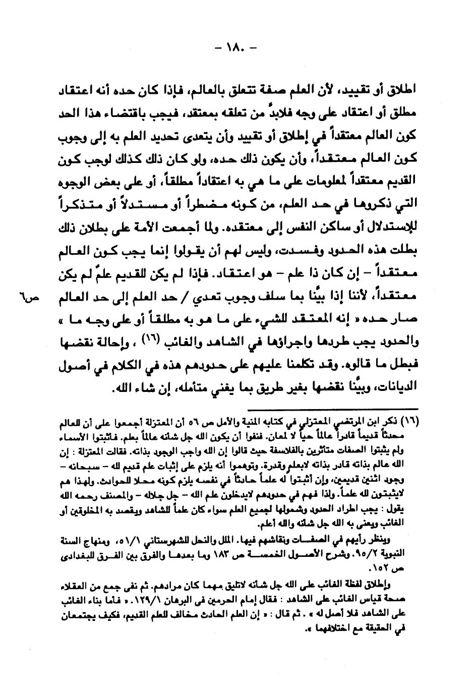 إطلاق أو تقييد, لأن العلم صفة تتعلق بالعالم, فإذا كان حده أنه اعتقاد مطلق أو اعتقاد على وجه فلابد من تعلقه بمعتقد, فيجب باقتضاء هذا الحد كون العالم معتقدا في إطلاق أو تقييد وأن يتعدى تحديد العلم به إلى وجوب كون العلم معتقدا، وأن يكون ذلك حده, ولو كان ذلك كذلك لوجب كون القديم معتقدا لمعلومات على ما هي به اعتقادا مطلقا, أو على بعض الوجوه التي ذكروها في حد العلم, من كونه مضطرا أو مستدلا أو متذكرا للاستدلال أو ساكن النفس إلى معتقده. ولما أجمعت الأمة على بطلان ذلك بطلت هذه الحدود وفسدت، وليس لهم أن يقولوا إنما يجب كون العالم معتقدا- إن كان ذا علم- هو اعتقاد. فإذا لم يكن للقديم علم لم يكن معتقدا, لأننا إذا بينا بما سلف وجوب تعدي ⦗٦⦘ حد العلم إلى حد العالم صار حده" إنه المعتقد للشيء على ما هو به مطلقا أو على وجه ما" والحدود يجب طردها وإجراؤها في الشاهد والغائب, وإحالة نقضها فبطل ما قالوه. وقد تكلمنا عليهم على حدودهم هذه في الكلام في أصول الديانات وبينا نقضها بغير طريق بما يغني متأملة. إن شاء الله.