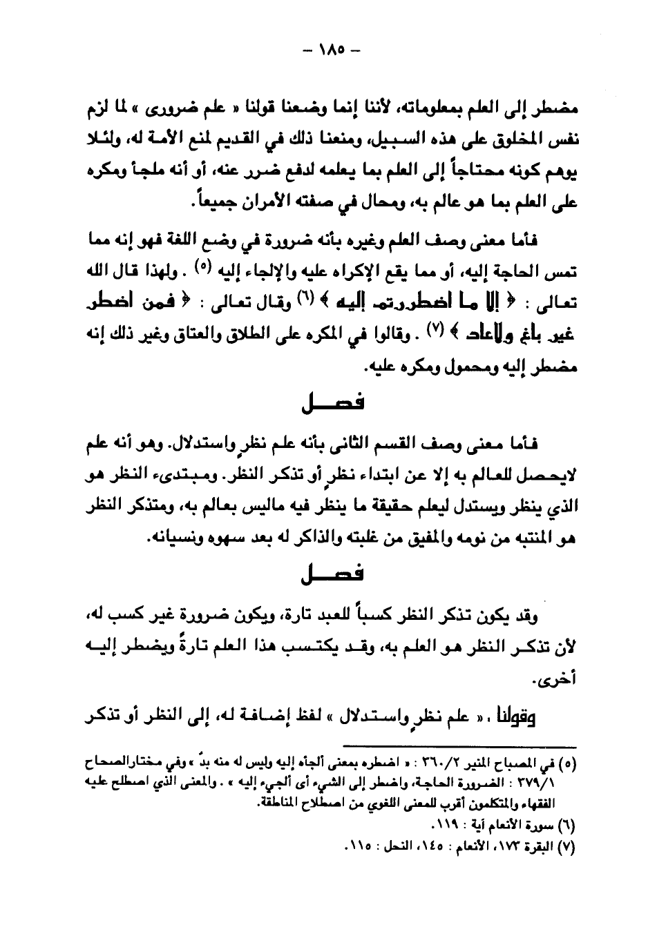 فأما معنى وصف العلم وغيره بأنه ضرورة في وضع اللغة فهو إنه مما تمس الحاجة إليه, أو مما يقع الإكراه عليه والإلجاء إليه. ولهذا قال الله تعالى: {إلاَّ مَا اضْطُرِرْتُمْ إلَيْه} وقال تعالى: {فَمَنِ اضْطُرَّ غَيْرَ بَاغٍ ولا عَاد}. وقالوا في المكره على الطلاق والعتاق وغير ذلك إنه مضطر إليه ومحمول ومكره عليه.