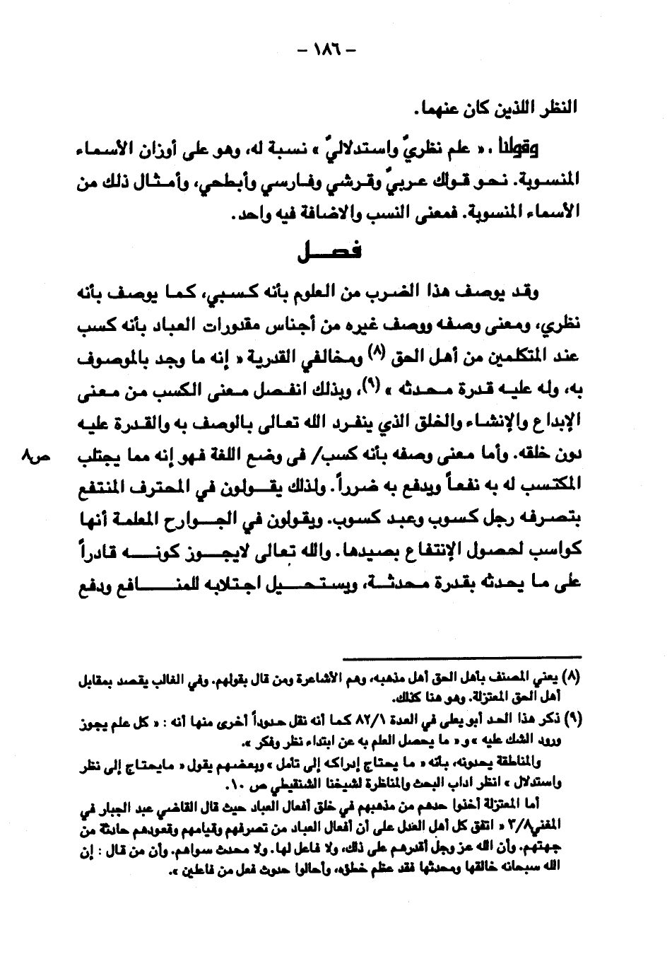 وقولنا: "علم نظري واستدلالي" نسبة له, وهو على أوزان الأسماء المنسوبة. نحو قولك عربي وقرشي وفارسي وأبطحي, وأمثال ذلك من الأسماء المنسوبة. فمعنى النسب والإضافة فيه واحد.