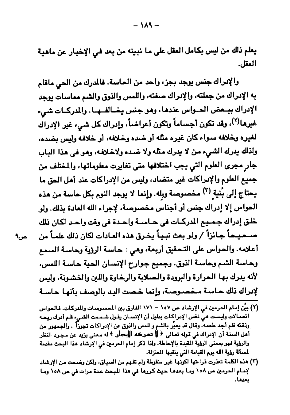 والإدراك جنس يوجد بجزء واحد من الحاسة. فالمدرك من الحي ما قام به الإدراك من جملته، والإدراك صفته, واللمس والذوق والشم مماسات يوجد الإدراك ببعض الحواس عندها, وهو جنس يخالفها. والمدركات شيء غيرها، وقد تكون أجساما وتكون أعراضا, وإدراك كل شيء غير الإدراك لغيره وخلافه سواء كان غيره مثله أو ضده وخلافه, أو خلافه وليس بضده, لذلك يدرك الشيء من لا يدرك مثله ولا ضده ولا خلافه, وهو في هذا الباب جار مجرى العلوم التي يجب اختلافها متى تغايرت معلوماتها, والمختلف من جميع العلوم والإدراكات غير متضاد, وليس من الإدراكات عند أهل الحق ما يحتاج إلى بنية مخصوصة وبله. وإنما لا يوجد النوم بكل حاسة من هذه الحواس إلا إدراك جنس أو أجناس مخصوصة، لإجراء الله العادة بذلك. ولوخلق إدراك جميع المدركات في حاسة واحدة في وقت واحد لكان ذلك صحيحا جائزا ⦗٩⦘ ولو بعث نبيا يخرق هذه العادات لكان ذلك عاما من أعلامه. والحواس على التحقيق أربعة, وهي: حاسة الرؤية وحاسة السمع وحاسة الشم وحاسة الذوق. وجميع جوارح الإنسان الحية حاسة اللمس, لأنه يدرك بها بها الحرارة والبرودة والصلابة والرخاوة واللين والخشونة، وليس إدراك ذلك حاسة مخصوصة, وإنما خصت اليد بالوصف بأنها حاسة