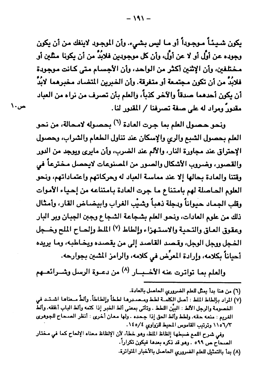 ونحو حصول العلم بما جرت العادة بحصوله لا محالة، من نحو العلم بحصول الشبع والري والإسكان عند تناول الطعام والشراب, وحصول الاحتراق عند مجاورة النار, والألم عند الضرب, وأن ما يرى ويوجد من الدور والقصور, وضروب الأشكال والصور من المصنوعات لا يحصل مخترعا في وقتنا والعادة بحالها إلا عند ممارسة العبادة له وحركاتهم واعتماداتهم, ونحو العلوم الحاصلة لهم بامتناع ما جرت العادة بامتناعه من إحياء الأموات وقلب الجماد حيوانا ودجلة ذهبا وشيب الغراب وابيضاض القار, وأمثال ذلك من علوم العادات, ونحو العلم بشجاعة الشجاع وجبن الجبان وبر البار وعقوق العاق والتحية والاستهزاء وإلطاط الملط وإلحاح الملح وخجل الخجل ووجل الوجل, وقصد القاصد إلى من يقصده ويخاطبه, وما يريده أحيانا بكلامه, وإرادة المعرض في كلامه, والرامز المشين بجوارحه.