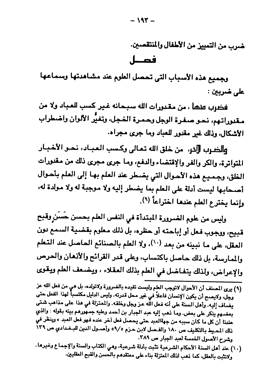 وليس من علوم الضرورة المبتدأة في النفس العلم بحسن حسن وقبح قبيح, ووجوب فعل أو إباحته أو حظره, بل ذلك معلوم بقضية السمع دون العقل, على ما نبيته من بعد, ولا العلم بالصنائع الحاصل عند التعلم والممارسة، بل ذلك حاصل باكتساب، وعلى قدر القرائح والأذهان والحرص والإعراض، ولذلك يتفاضل في العلم بذلك العقلاء, ويضعف العلم ويقوى