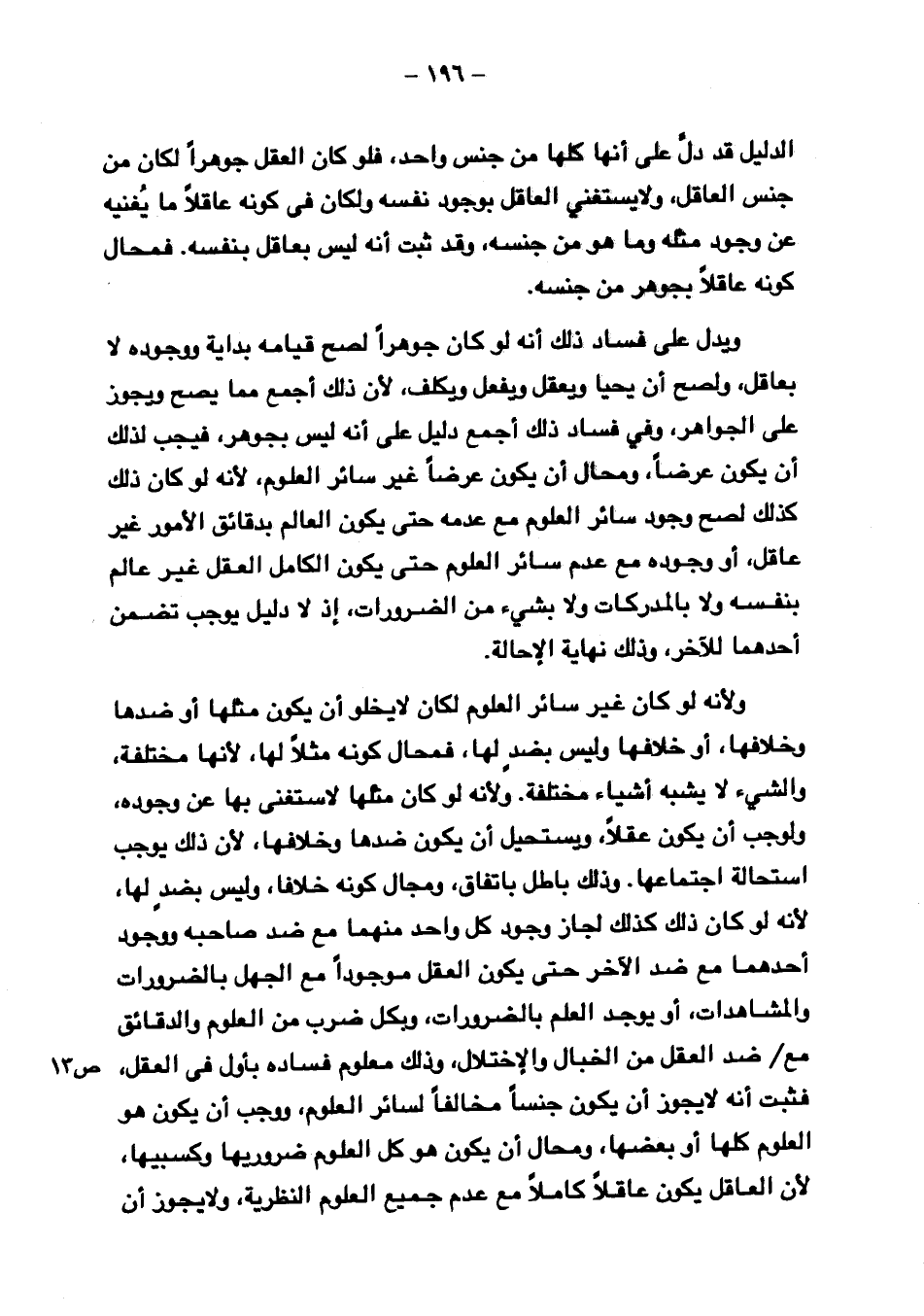 ولأنه لو كان غير سائر العلوم لكان لا يخلو أن يكون مثلها أو ضدها وخلافها, أو خلافها وليس بضد لها, فمحال كونه مثلا لها, لأنها مختلفة, والشيء لا يشبه أشياء مختلفة. ولأنه لو كان مثلها لاستغنى بها عن وجوده ولوجب أن يكون عقلا, ويستحيل أن يكون ضدها وخلافها، لأن ذلك يوجب استحالة اجتماعها. وذلك باطل باتفاق, ومجال كونه خلافا, وليس بضد لها, لأنه لو كان ذلك كذلك لجاز وجود كل واحد منهما مع ضد صاحبه ووجود أحدهما مع ضد الآخر حتى يكون العقل موجودا مع الجهل بالضرورات والمشاهدات, أو يوجد العلم بالضرورات, وبكل ضرب من العلوم والدقائق مع ⦗١٣⦘ ضد العقل من الخبال والاختلال، وذلك معلوم فساده بأول في العقل, فثبت أنه لا يجوز أن يكون جنسا مخالفا لسائر العلوم، ووجب أن يكون هو العلوم كلها أو بعضها، ومحال أن يكون هو كل العلوم ضروريها وكسبيها, لأن العاقل يكون عاقلا كاملا مع عدم جميع العلوم النظرية، ولا يجوز أن