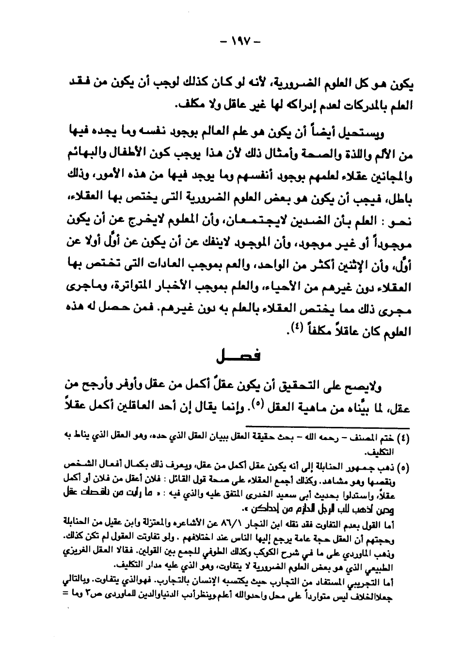 ويستحيل أيضا أن يكون هو علم العالم بوجود نفسه وما يجده فيها من الألم واللذة والصحة وأمثال ذلك هذا يوجب كون الأطفال والبهائم والمجانين عقلاء لعلمهم بوجود أنفسهم وما يوجد فيها من هذه الأمور, وذلك باطل, فيجب أن يكون هو بعض العلوم الضرورية التي يختص بها العقلاء, نحو: العلم بأن الضدين لا يجتمعان، وأن المعلوم لا يخرج عن أن يكون موجودا أو غير موجود لا ينفك عن أن يكون عن أول أولا عن أول, وإن الاثنين أكثر من الواحد، والعم بموجب العادات التي تختص بها العقلاء دون غيرهم من الأحياء, والعلم بموجب الأخبار المتواترة, وما جرى مجرى ذلك مما يختص العقلاء بالعلم به دون غيرهم فمن حصل له هذه العلوم كان عاقلا مكلفا.