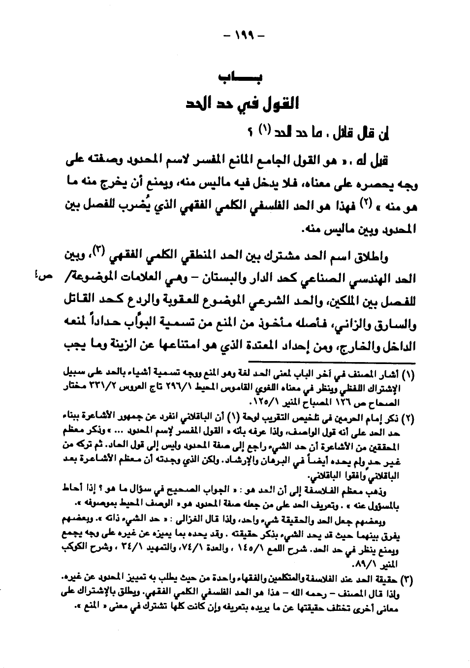 وإطلاق اسم الحد مشترك بين الحد المنطقي الكلمي الفقهي وبين الحد الهندسي الصناعي كحد الدار والبستان- وهي العلامات الموضوعة ⦗٤⦘ للفصل بين الملكين, والحد الشرعي الموضوع للعقوبة والردع كحد القاتل والسارق والزاني، فأصله مأخوذ من المنع من تسمية البواب حدادا لمنعه الداخل والخارج, ومن إحداد المعتدة الذي هو امتناعها عن الزينة وما يجب