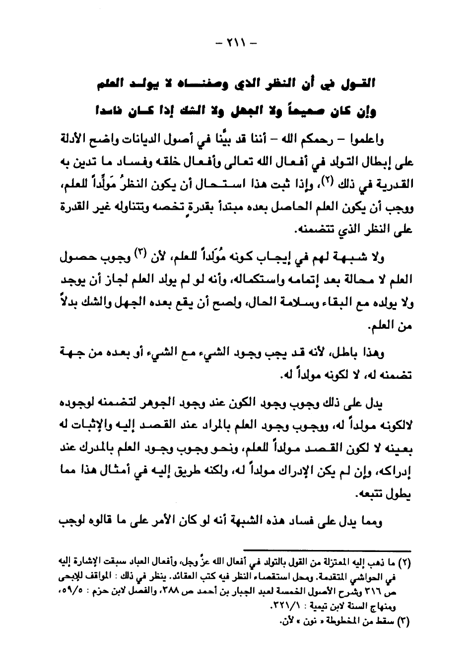 واعلموا- رحمكم الله- أننا قد بينا في أصول الديانات واضح الأدلة على إبطال التولد في أفعال الله تعالى وأفعال خلقه وفساد ما تدين به القدرية في ذلك, وإذا ثبت هذا استحال أن يكون النظر مولدا للعلم, ووجب أن يكون العلم الحاصل بعده مبتدأ بقدرة تخصه وتتناوله غير القدرة على النظر الذي تتضمنه.