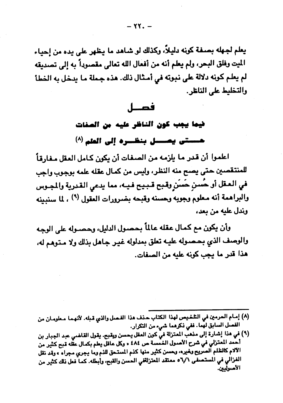 اعلموا أن قدر ما يلزمه من الصفات أن يكون كامل العقل مفارقا للمنتقصين حتى يصح منه النظر, وليس من كمال عقله علمه بوجوب واجب في العقل أو حسن حسن وقبح قبيح فيه, مما يدعي القدرية والمجوس والبراهمة أنه معلوم وجوبه وحسنه وقبحه بضرورات العقول, لما سنبينه وندل عليه من بعد.