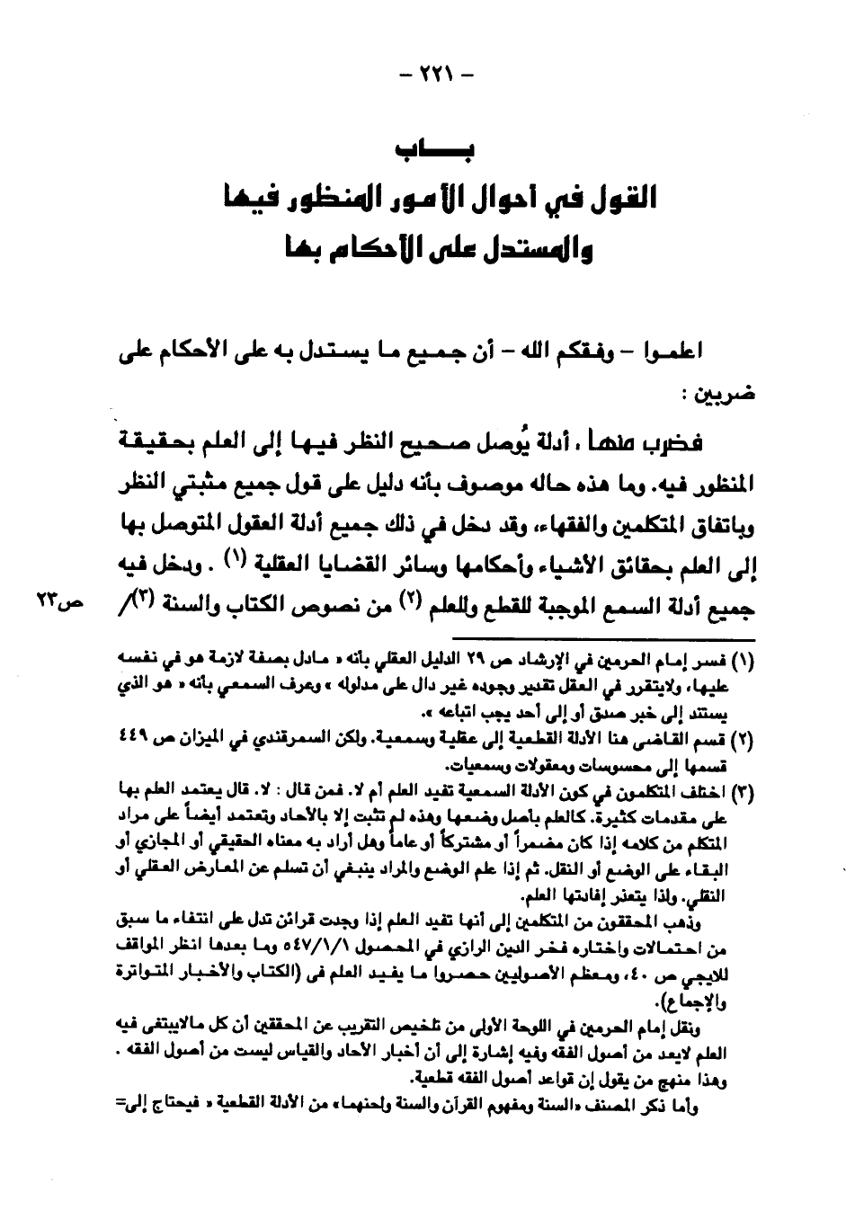 فضرب منها، أدلة يوصل صحيح النظر فيها إلى العلم بحقيقة المنظور فيه. وما هذه حاله موصوف بأنه دليل على قول جميع مثبتي النظر وباتفاق المتكلمين والفقهاء، وقد دخل في ذلك جميع أدلة العقول المتوصل بها إلى العلم بحقائق الأشياء وأحكامها وسائر القضايا العقلية. ودخل فيه جميع أدلة السمع الموجبة للقطع وللعلم من نصوص الكتاب والسنة/ ص ٢٣