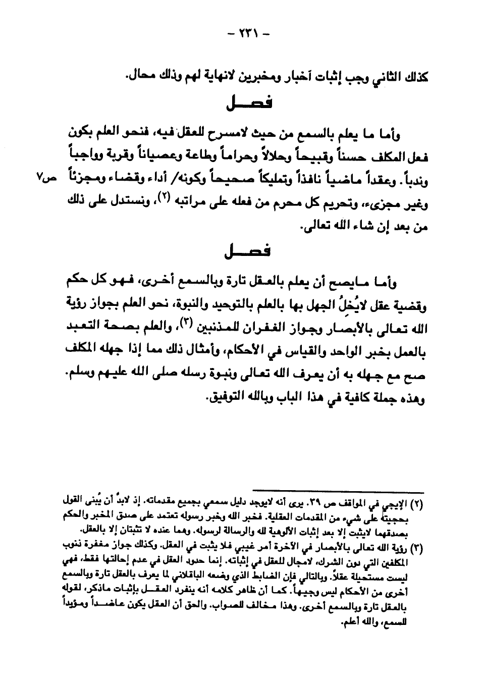 وأما ما يعلم بالسمع من حيث لا مسرح للعقل فيه, فنحو العلم بكون فعل المكلف حسنًا وقبيحًا وحلالًا وحرامًا وطاعة وعصيانًا وقربة وواجبًا وندبًا, وعقدًا ماضيًا نافذًا وتمليكًا صحيحًا وكونه/ ص ٧ أداء وقضاء ومجزئًا وغير مجزئ, وتحريم كل محرم من فعله على مراتبه, ونستدل على ذلك من بعد إن شاء الله تعالى.