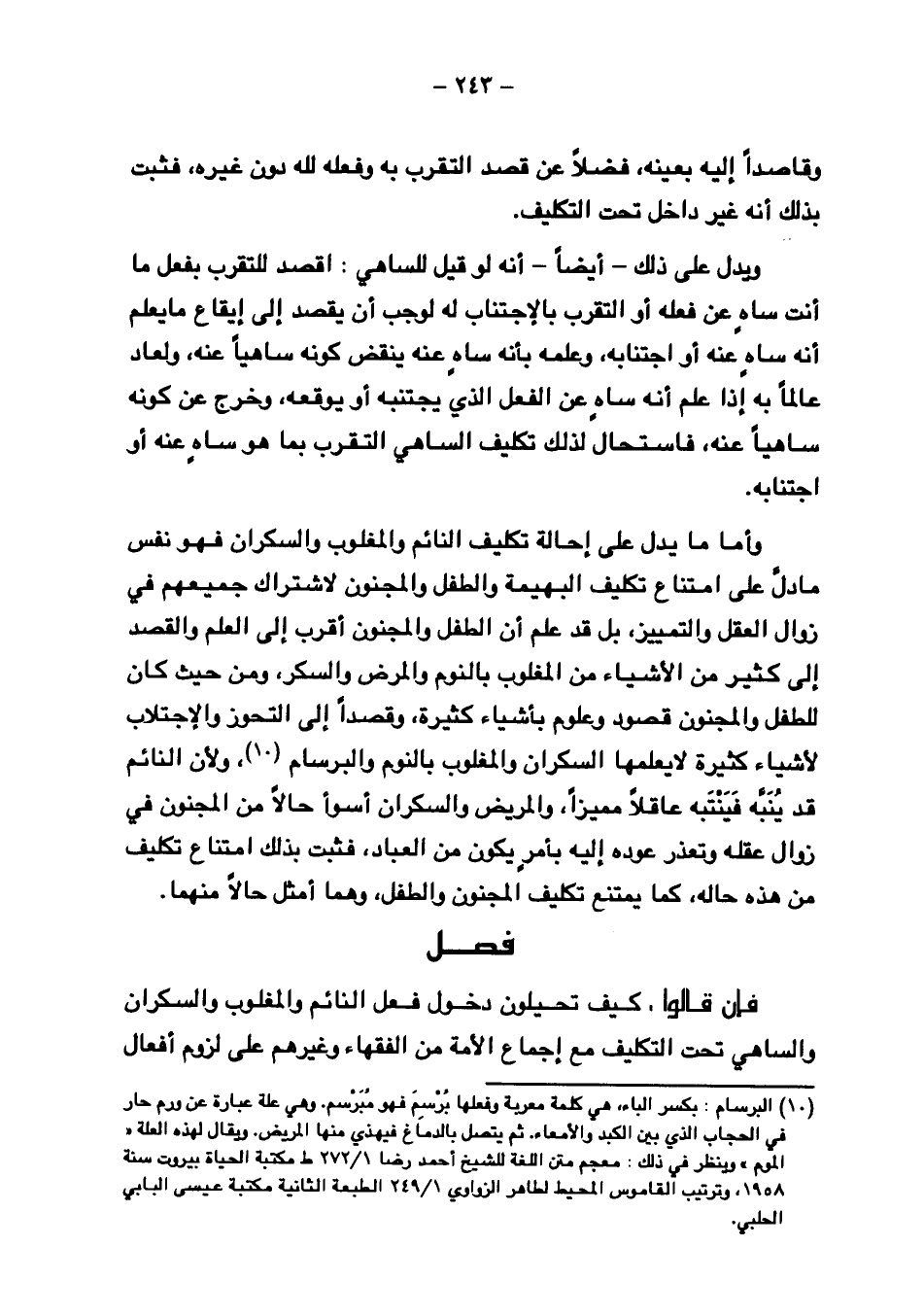 ويدل على ذلك - أيضًا - أنه لو قيل للساهي: أقصد للتقرب بفعل ما أنت ساه عن فعله أن التقرب بالاجتناب له لوجب أن يقصد إلى إيقاع ما يعلم أنه ساه عنه أو اجتنابه, وعلمه بأنه ساه عنه ينقض كونه ساهيًا عنه, ولعاد عالمًا به إذا علم أنه ساه عن الفعل الذي يجتنبه أو يوقعه, وخرج عن كونه ساهيًا عنه, فاستحال لذلك تكليف الساهي التقرب بما هو ساه عنه أو اجتنابه.